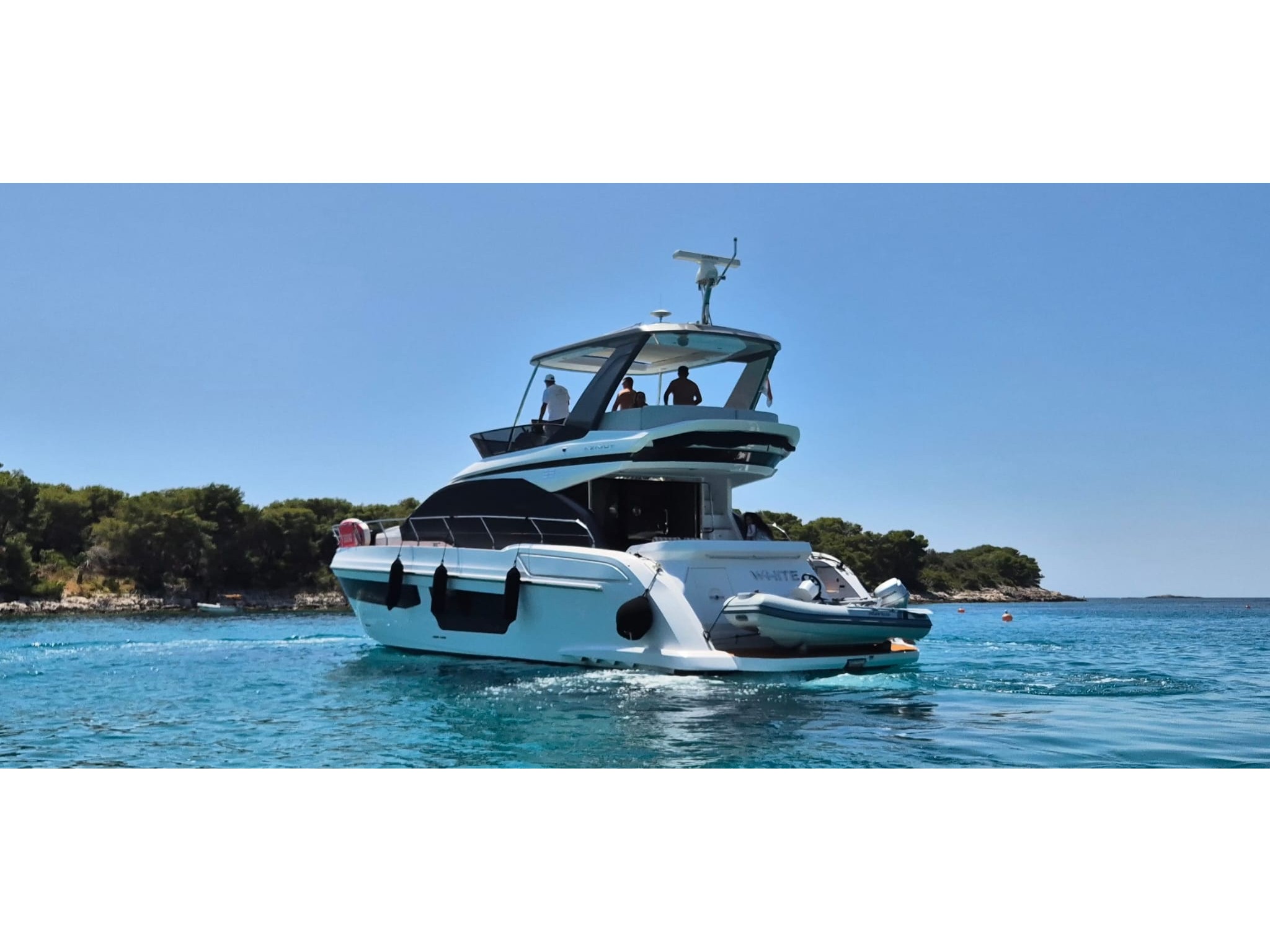 FendersDinghyLife raft for 12 personsTelescopic gangwayHard top on flybridge (painted in Etna Grey)Flybridge with wet bar (grill, sink and fridge)Exterior upholstery upgraded to Batyline fabricProtective covers for flybridge helm, dashboard, and sofaMesh covers for all windows2 additional cleats on transom Bow sunbathing cushions (with covers, Batyline fabric)Hydraulic swimming platformGarmin Gold package/AIS 800Joystick control at flybridge helmAssisted docking systemNavigation safety gearFully Equipped Galley Miele appliances (oven, cooktop and dishwasher)Washer-dryer comboRemovable IcemakerTVs in VIP cabin and salon - SamsungMosquito nets for portholesWine cooler in galleyHi-lo system for TV in salonInterior dimmer lights (salon and cabins)Flybridge dimmer lightsShore water plugCustom carpet: Moquette DIVINA ICELANDICFully equipped crew cabin with toilet, sink, and air conditioningAir ConditioningGeneratorElectric mooring winches (cockpit) - QuickMotorised shore power cable reelWatermaker predispositionCarbon monoxide detectorsElectric searchlight with additional controlExtra conduitsGalvanic isolatorDouble Racor filtersStand up paddle (SUP)Seabob (FS5)Snorkeling gearsSeakeeper stabilizer 9Automatic Volvo Interceptor systemVolvo Penta D11 IPS with JoystickSecond station with Joystick on flybridge
