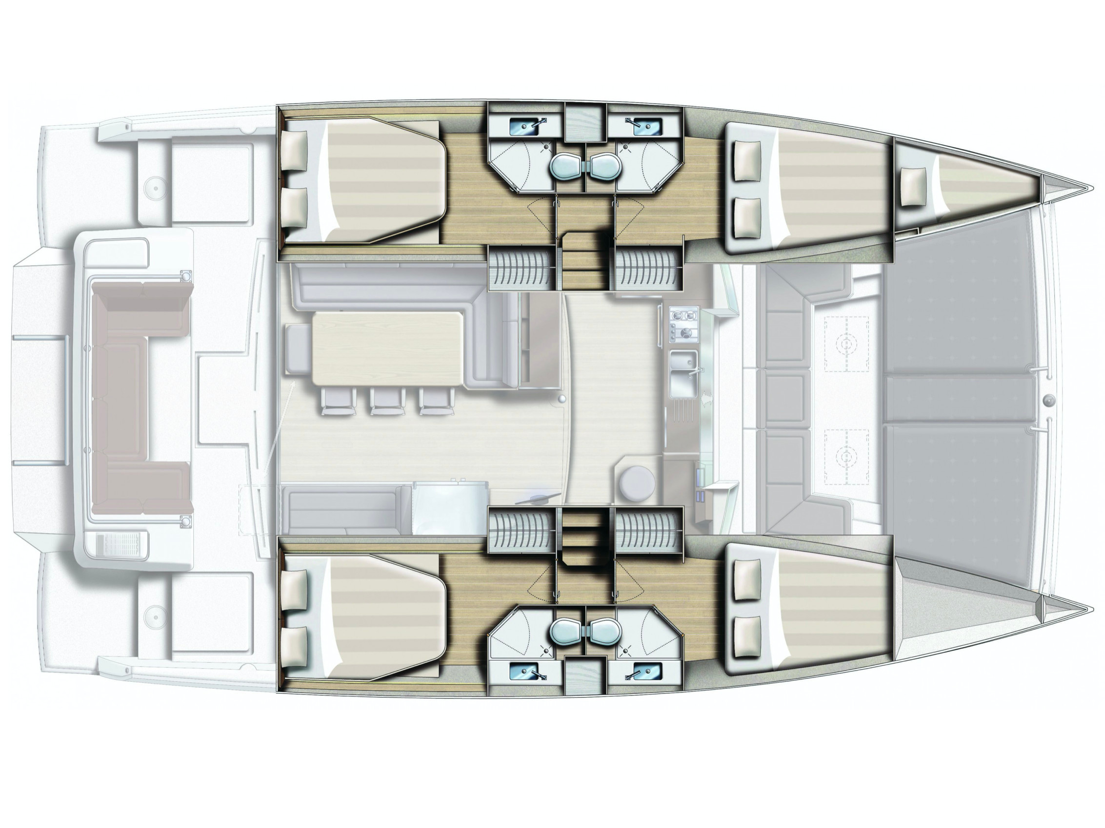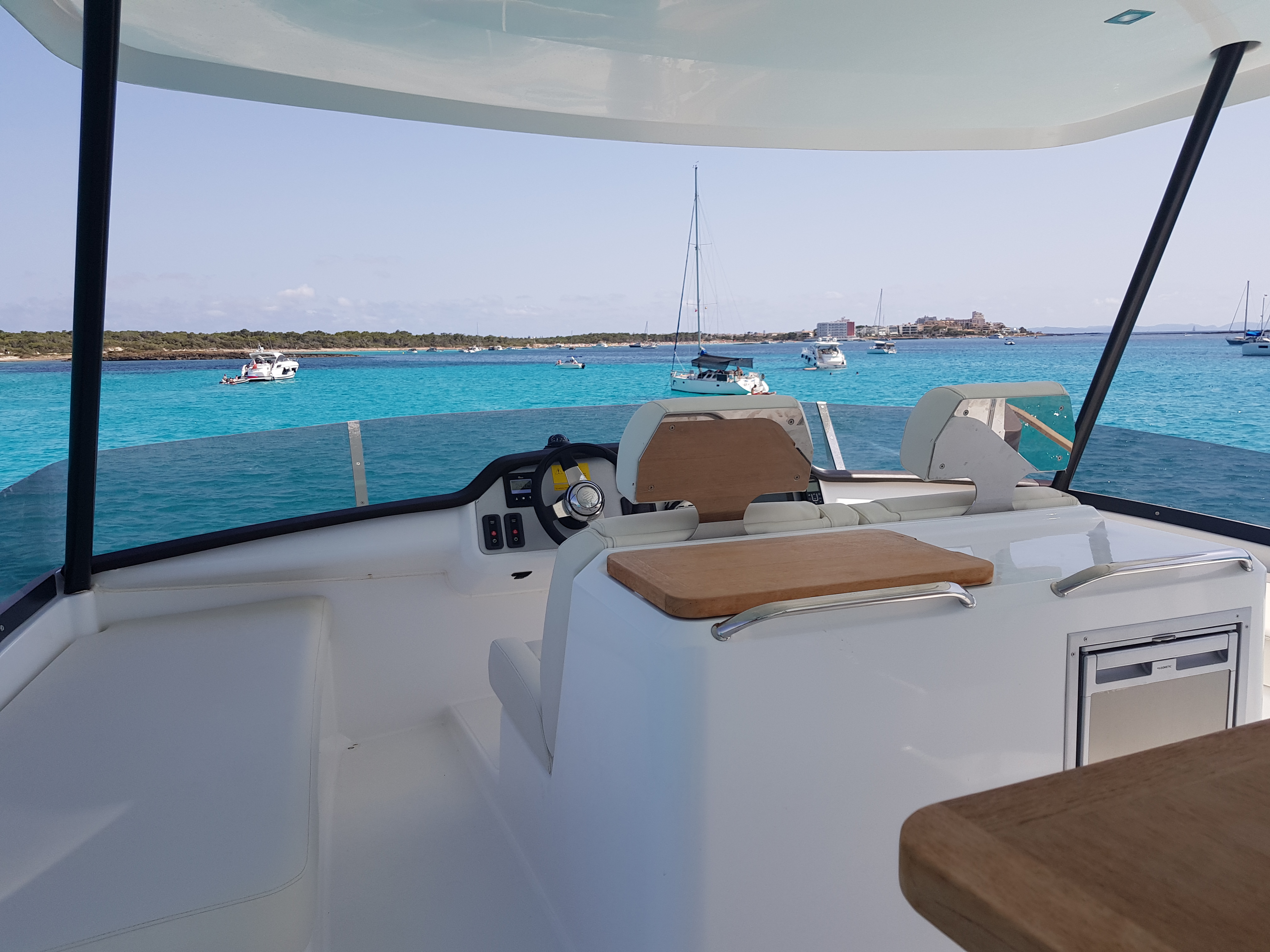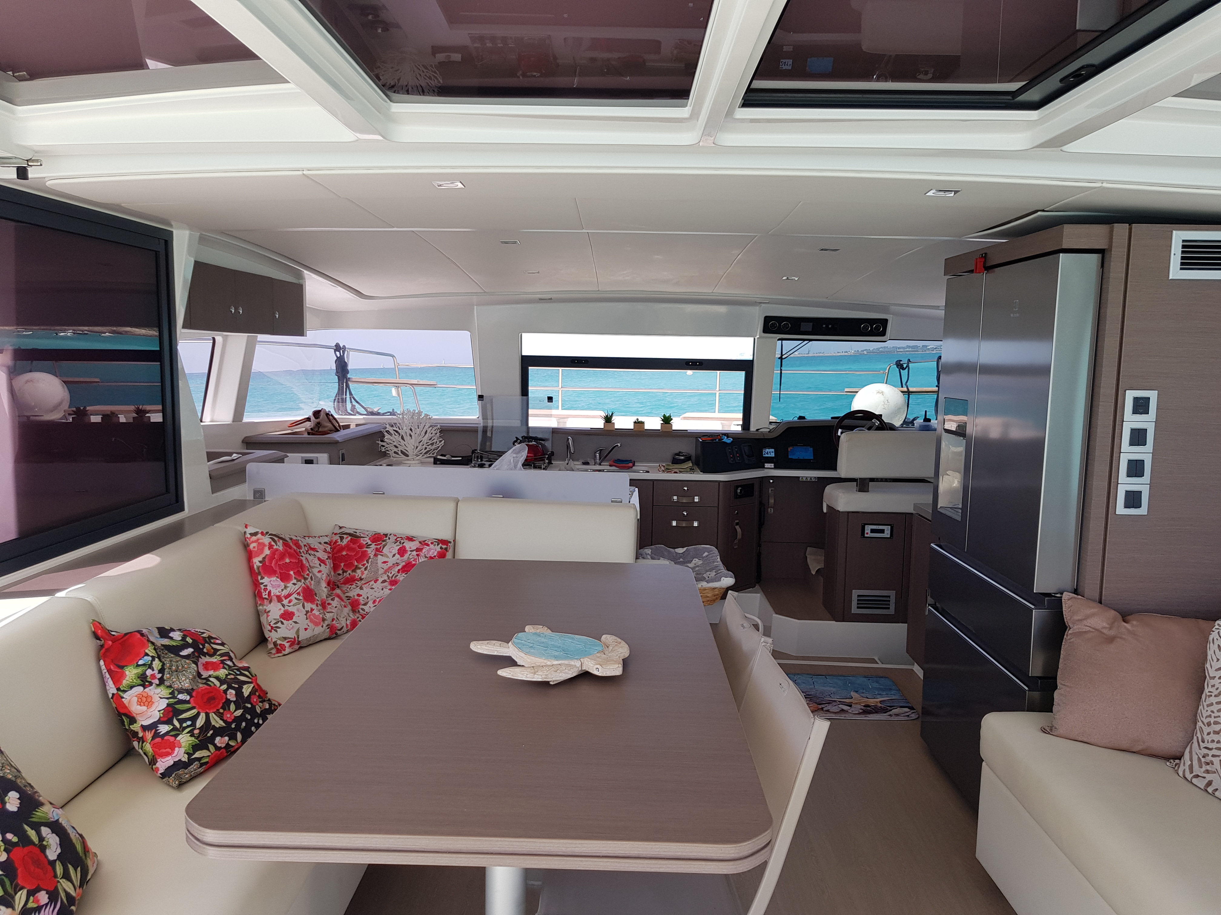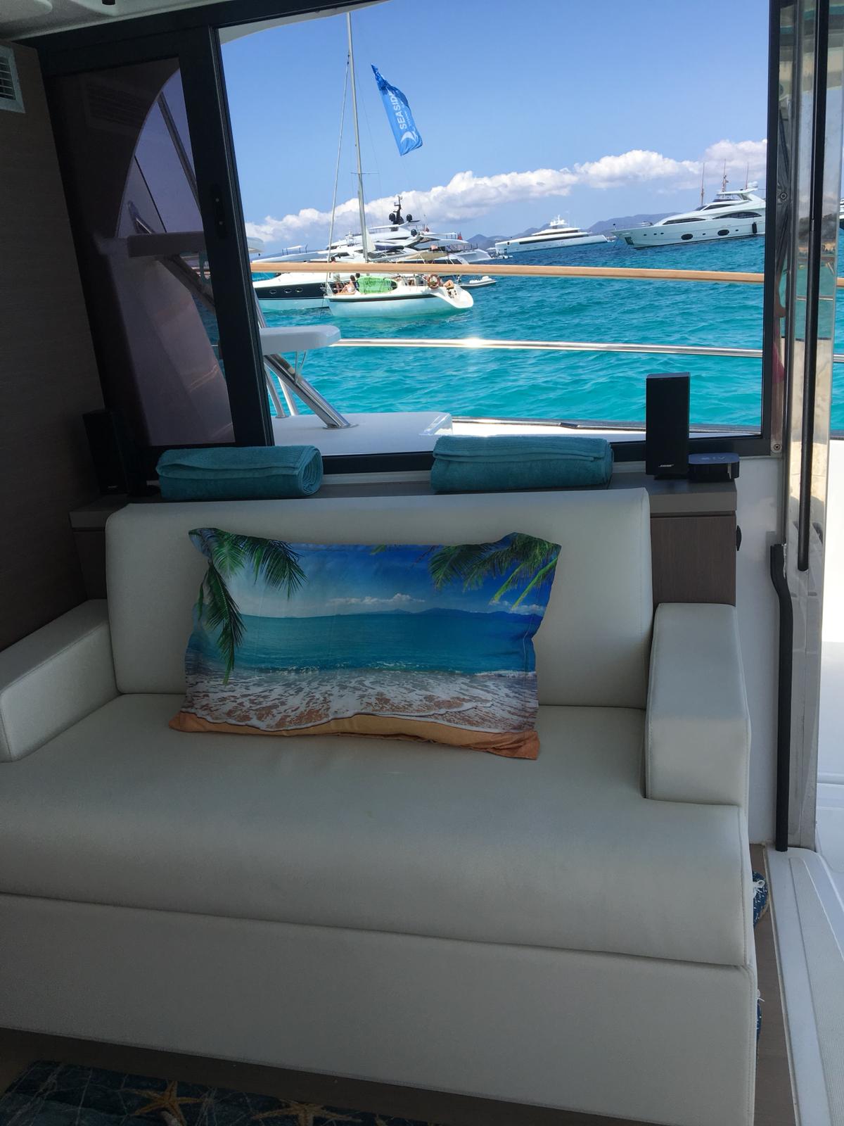 DishwasherOvenFridge with FreezerIce makerTVFansMosquito netsRadio HIFI Fusion GHP Bluetooth with speakersMicrowaveSwimming ladderFridgeSundeck cushionsGeneratorSolar panelsSpeakersHard topFlybridgeDinghy platformWatermakerExterior showerLed underwater lights Electric windlass with remote controlDinghy