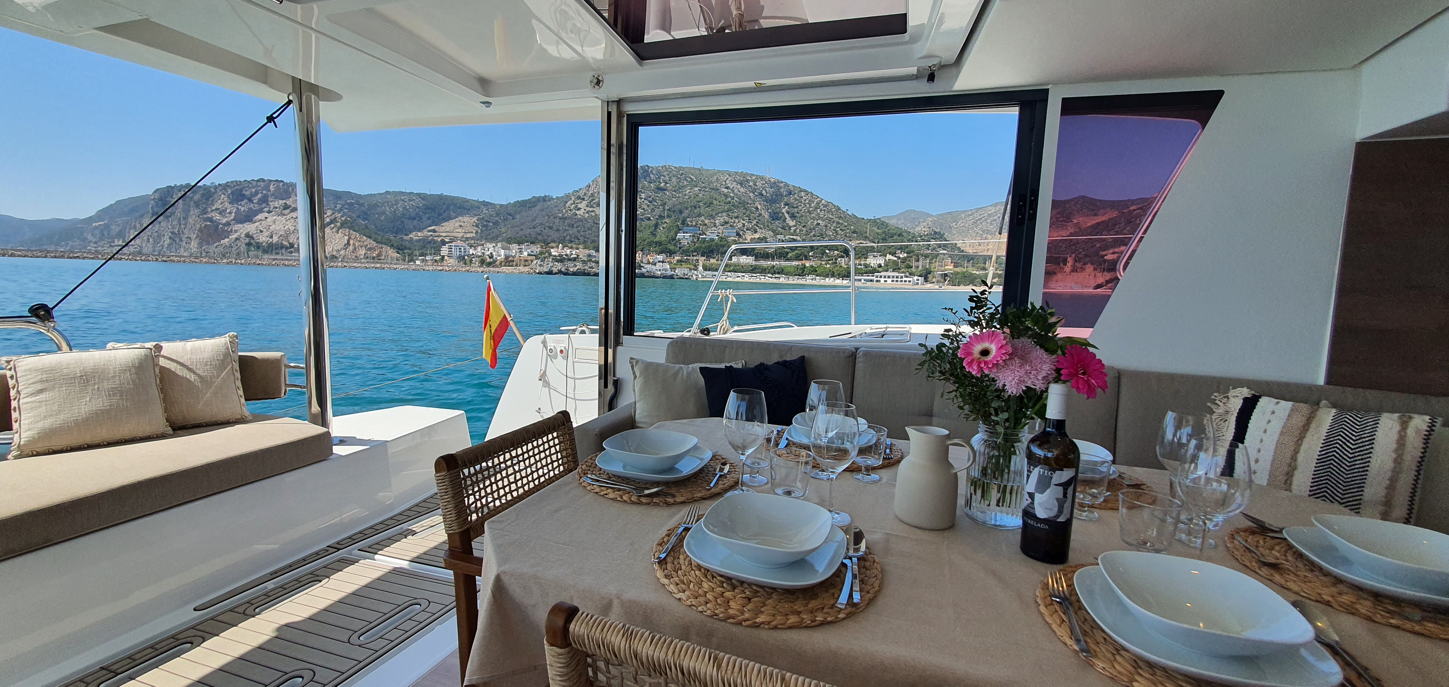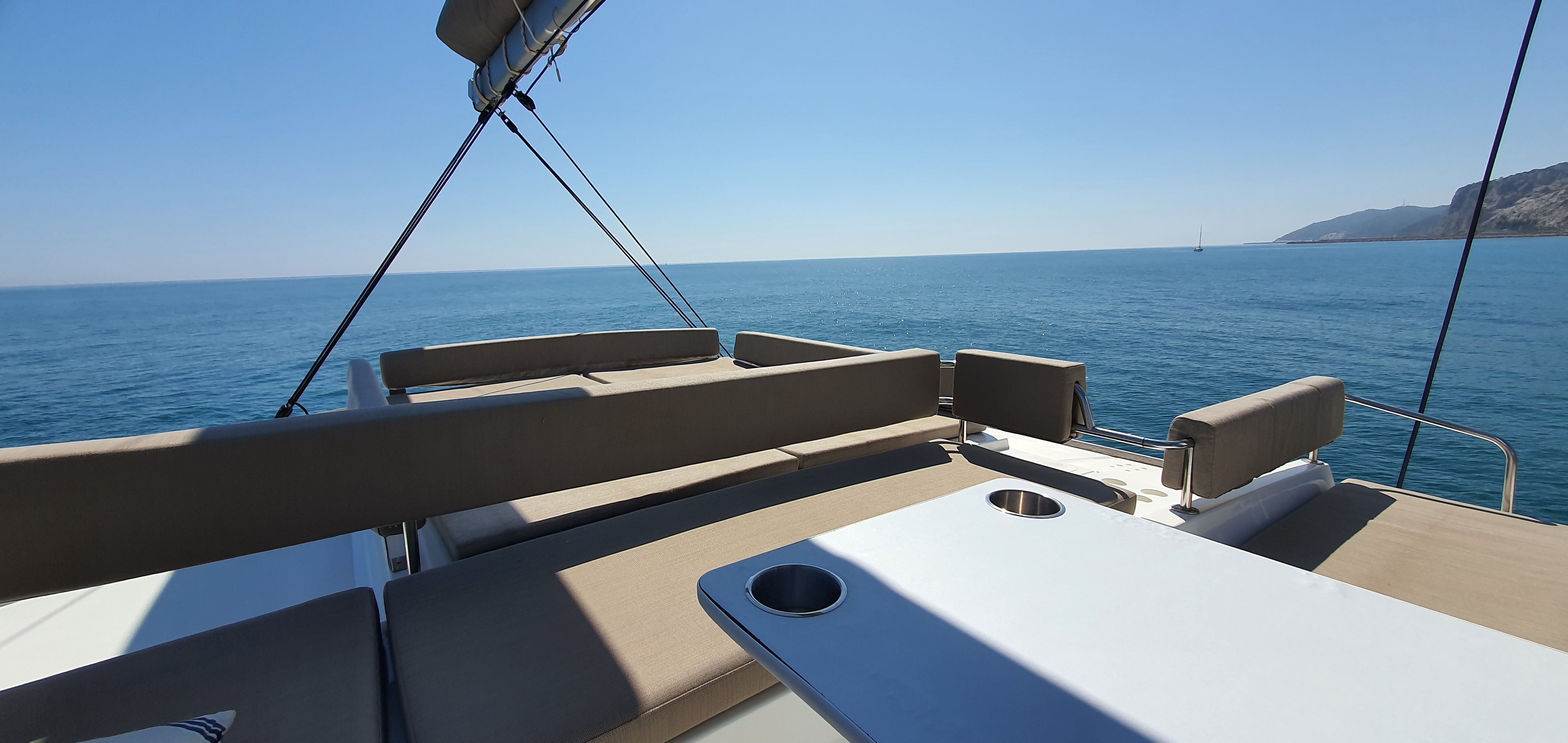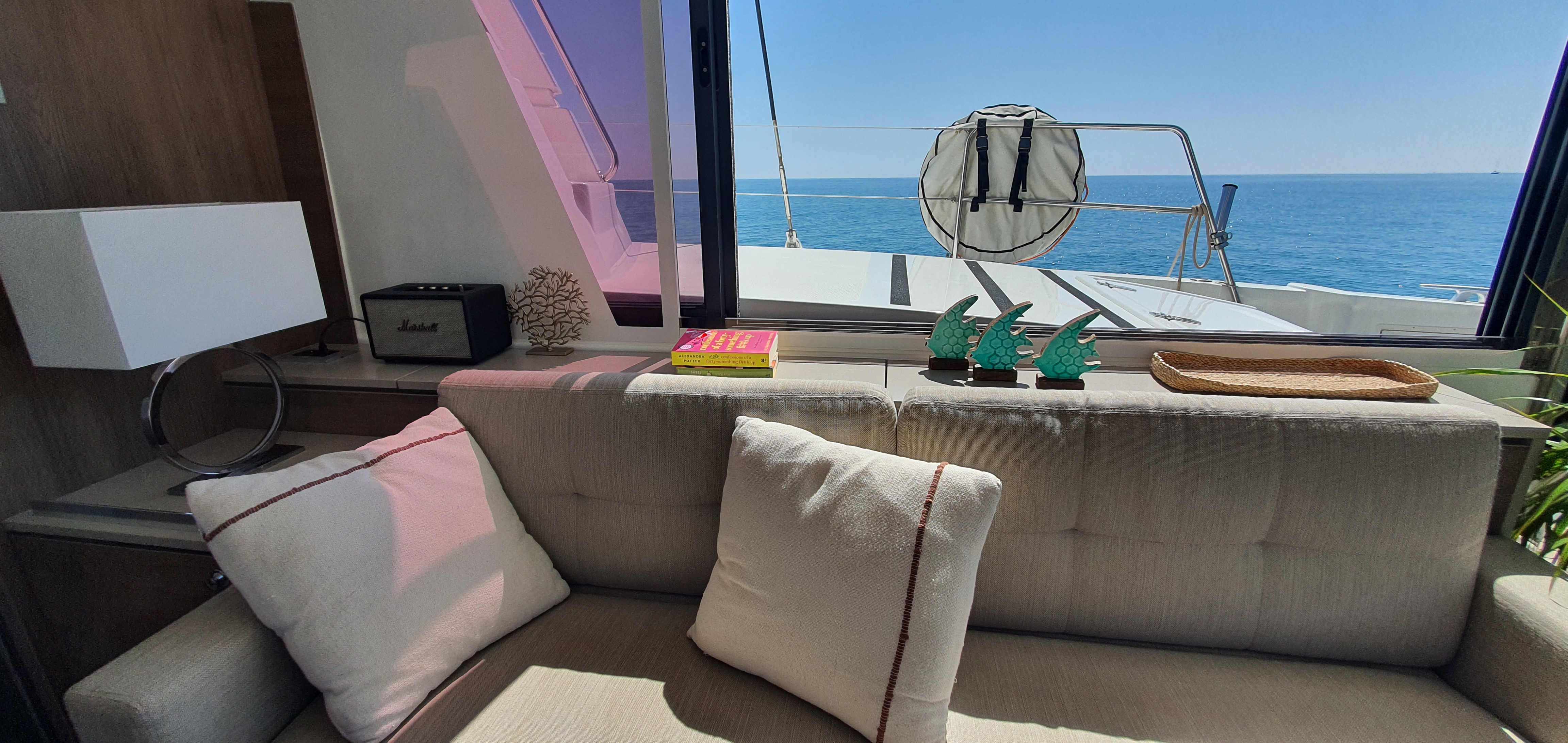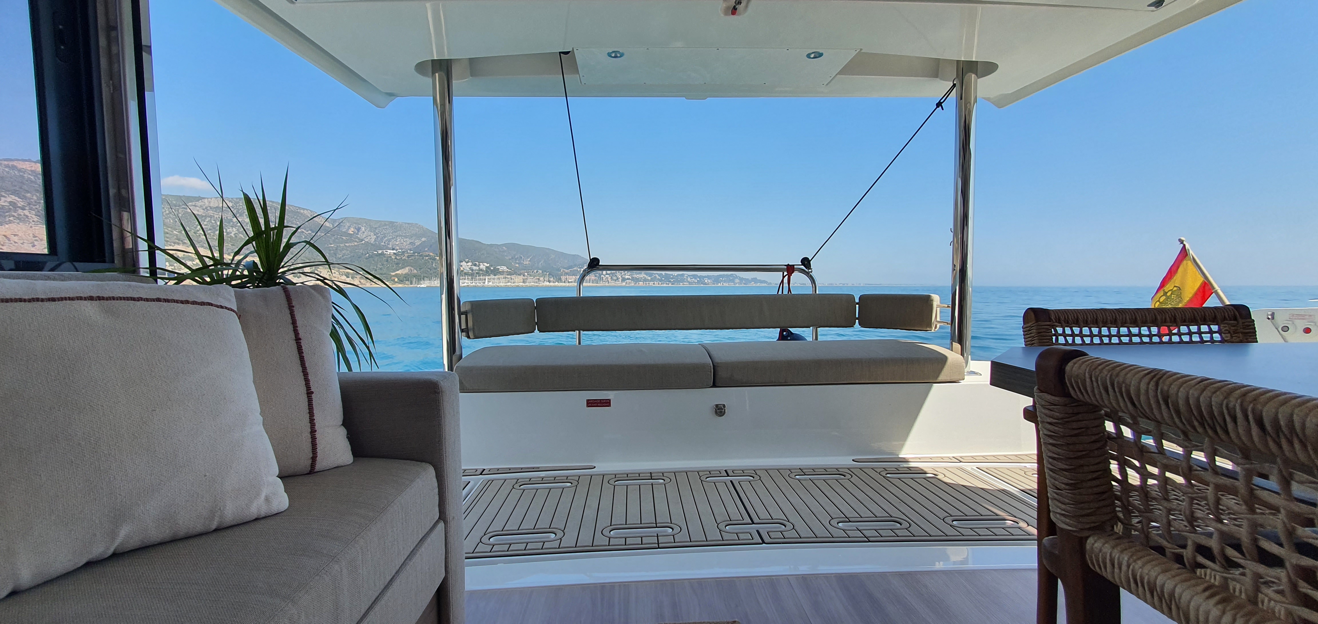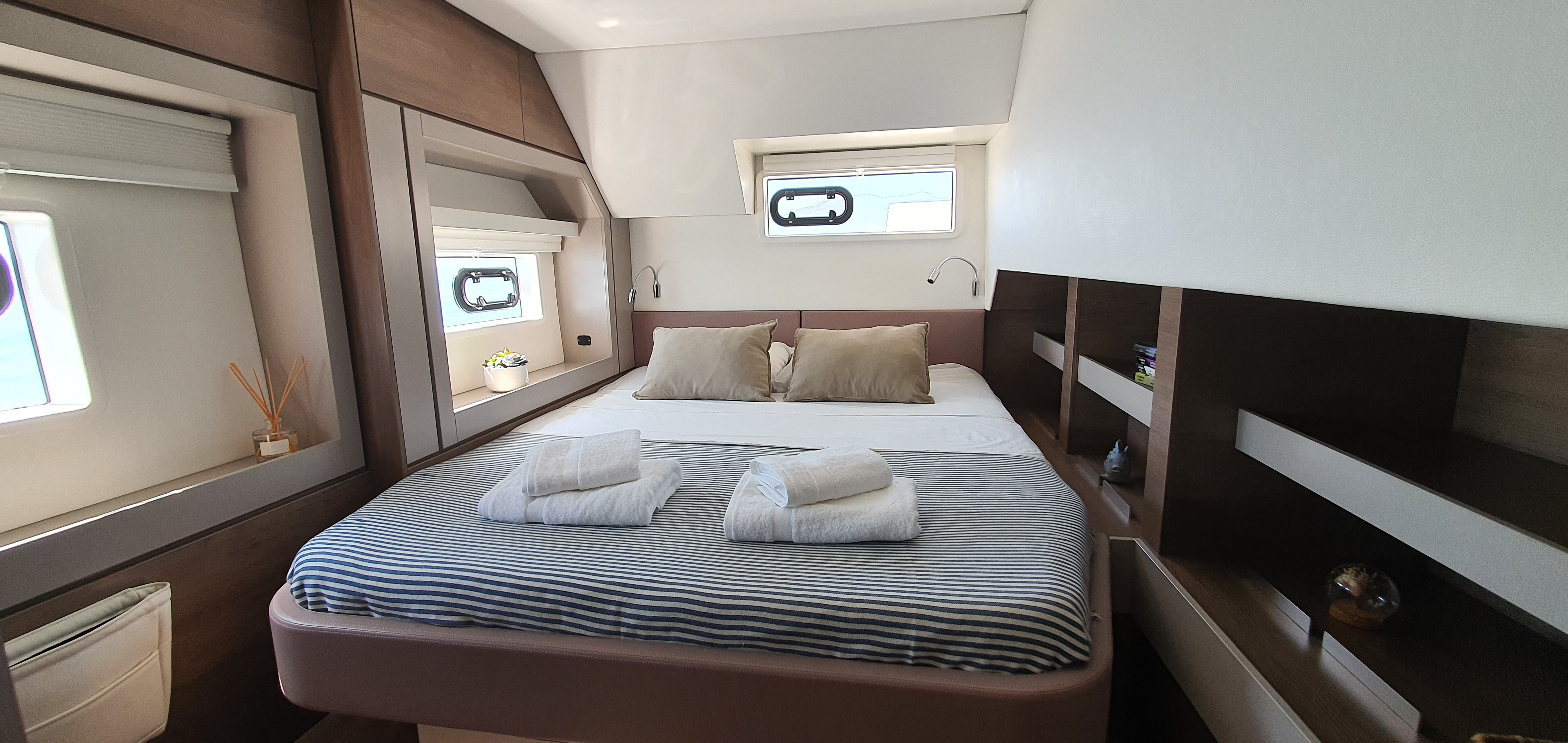 Comfortable swim ladder with large handles and teak stepsHiFi Radio Fusion 4 HP bluetoothBattery chargerAmerican fridgeDishwasherDavits for dinghyHot & Cold cockpit showerForward cockpit cushionsElectric toilet head with fresh waterSaloon litling bayElectrical 1000W windlassAft back cushionsIce makerHouse fridge freezer (615L) with chilled water, ice maker and inverter Solar panels2x12V extra service batteries of 130ampAft cockpit courtesy lightingHelmsman seat cushionEngine room & locker hatches on gas strutsBlinds in all cabinsGas ovenPlotterAutopilotCompassGPSAir conditioning in cabinsBar integrated in salon table with reversible trayChart table with navigation equipmentsGas cooker+inductionMicrowaveLed navigation lightsComplet Raymarine Electronic packPaddle surfLiferaftTenderSnorkel equipmentCockpit cushionsStern spring cleatsEPIRBAnchor + chain + bridleFenders + moorings linesAISLazy bagLazy jack