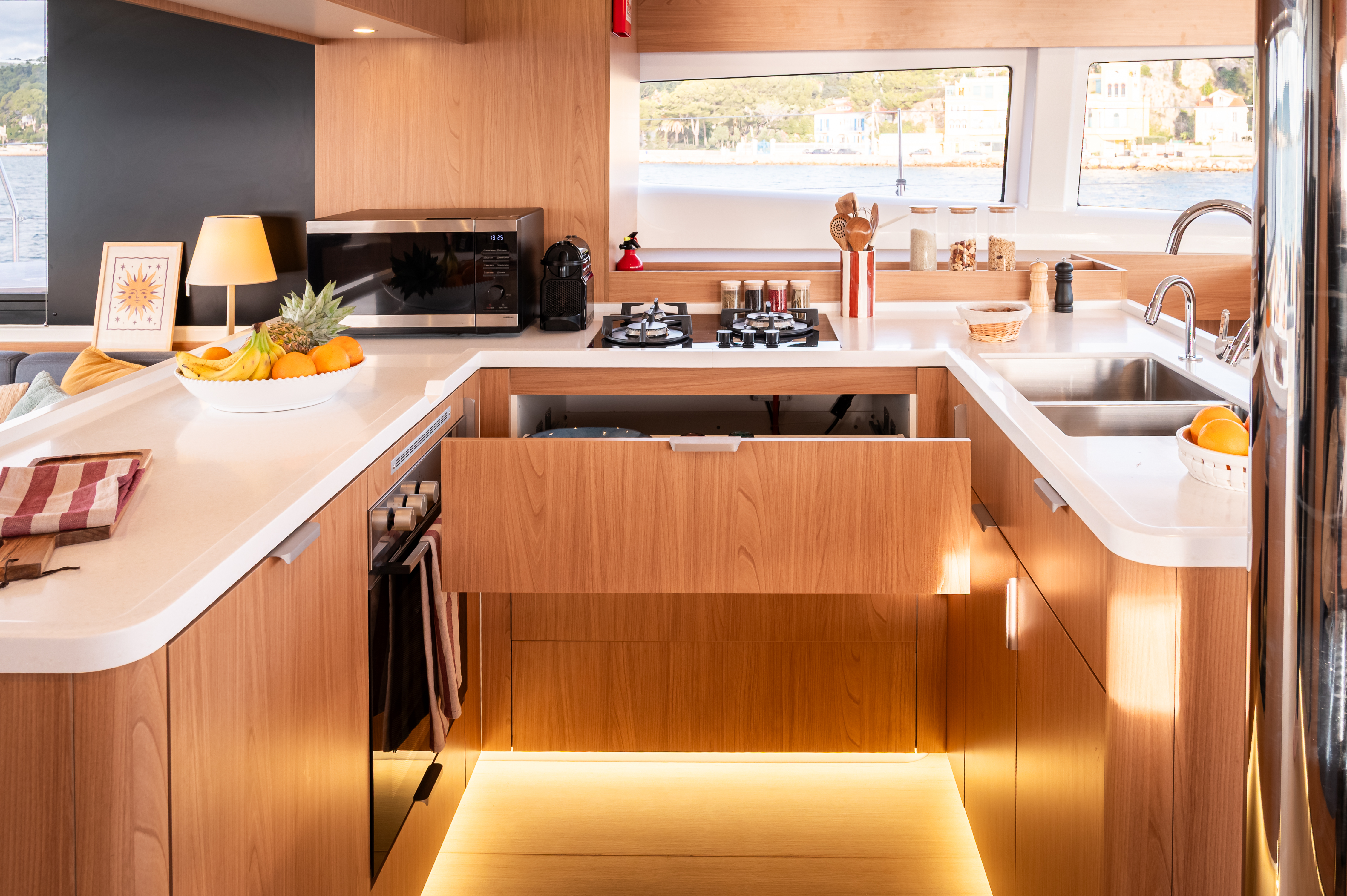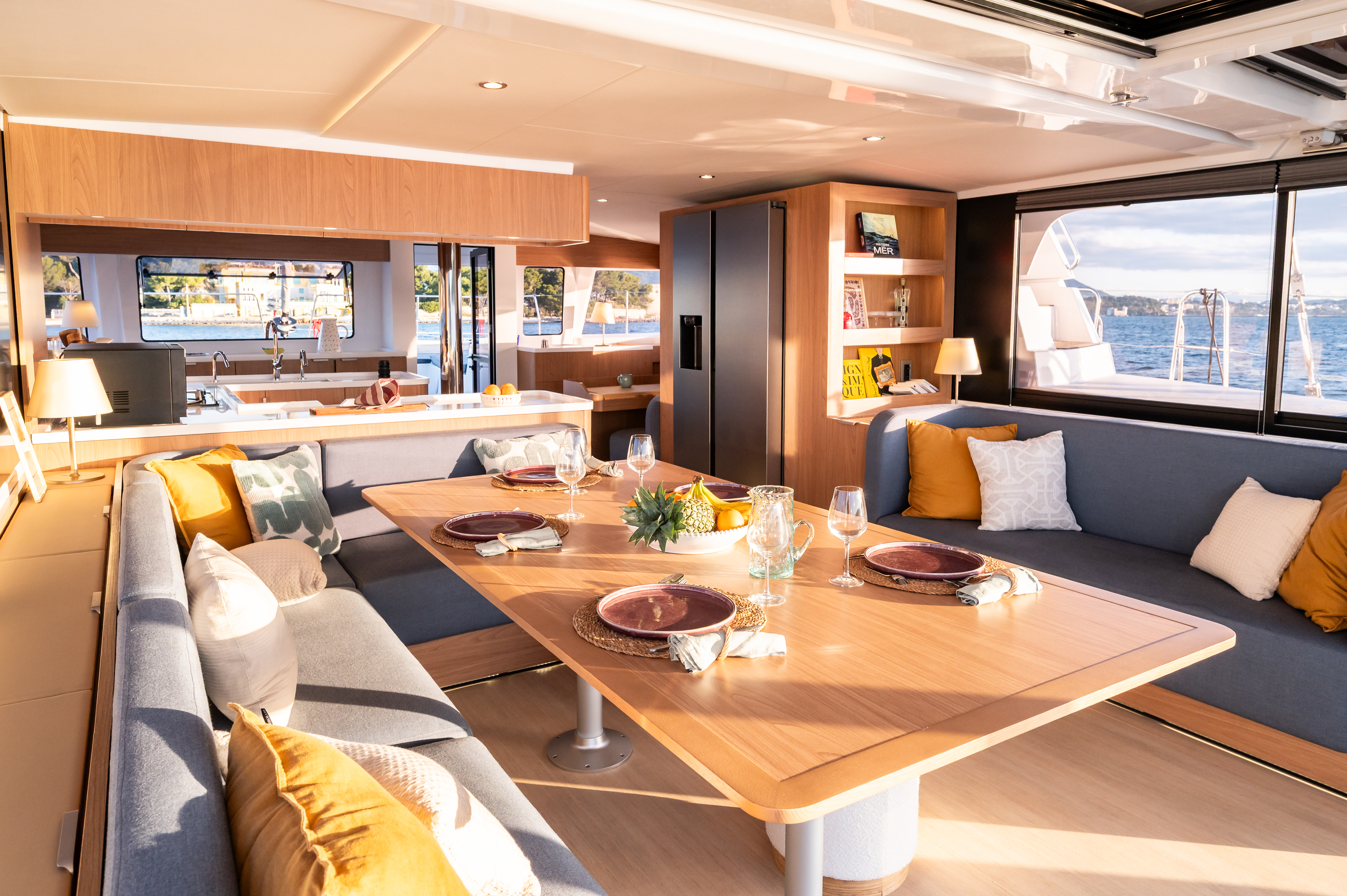 Aft bench cushionsComfortable swim ladder with large handles and teak stepsLED courtesy lights on deckDavits for dinghyHot & Cold cockpit showerForward cockpit cushionsElectric toilet head with fresh waterSaloon litling bayAft back cushionsSolar panels2x12V extra service batteries of 130ampSaloon to forward-cockpit opening windowSliding lateral windowsAft cockpit courtesy lightingHelmsman seat cushionEngine room & locker hatches on gas strutsBlinds in all cabinsHard TopInverterGas ovenCompassGPSCockpit speakersDeep freezerBattery chargerSound system salon/cockpit/Upper deckIce makerAir conditioning in cabinsDishwasherMicrowaveAutopilotFull batten mainsailComplet Raymarine Electronic pack3 blades folding propellerElectric windlassCockpit tableCockpit showerTenderSnorkel equipmentCockpit cushionsComplet Safety equipmentAnchor + chain + bridleSafety equipment for 10 with liferaft (without EPIRB)Lazy bagElectrical winch for mainsail halyardLazy jackFurling genoa