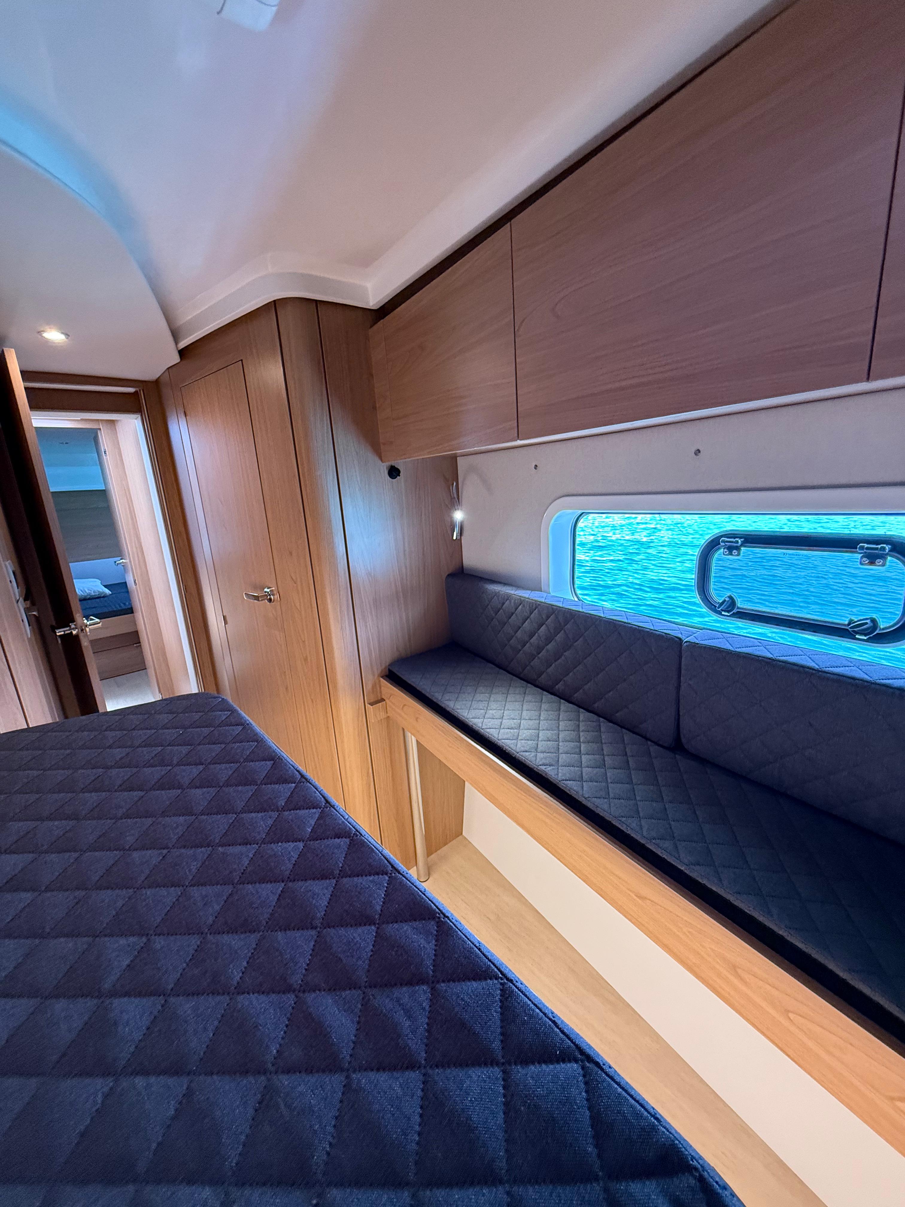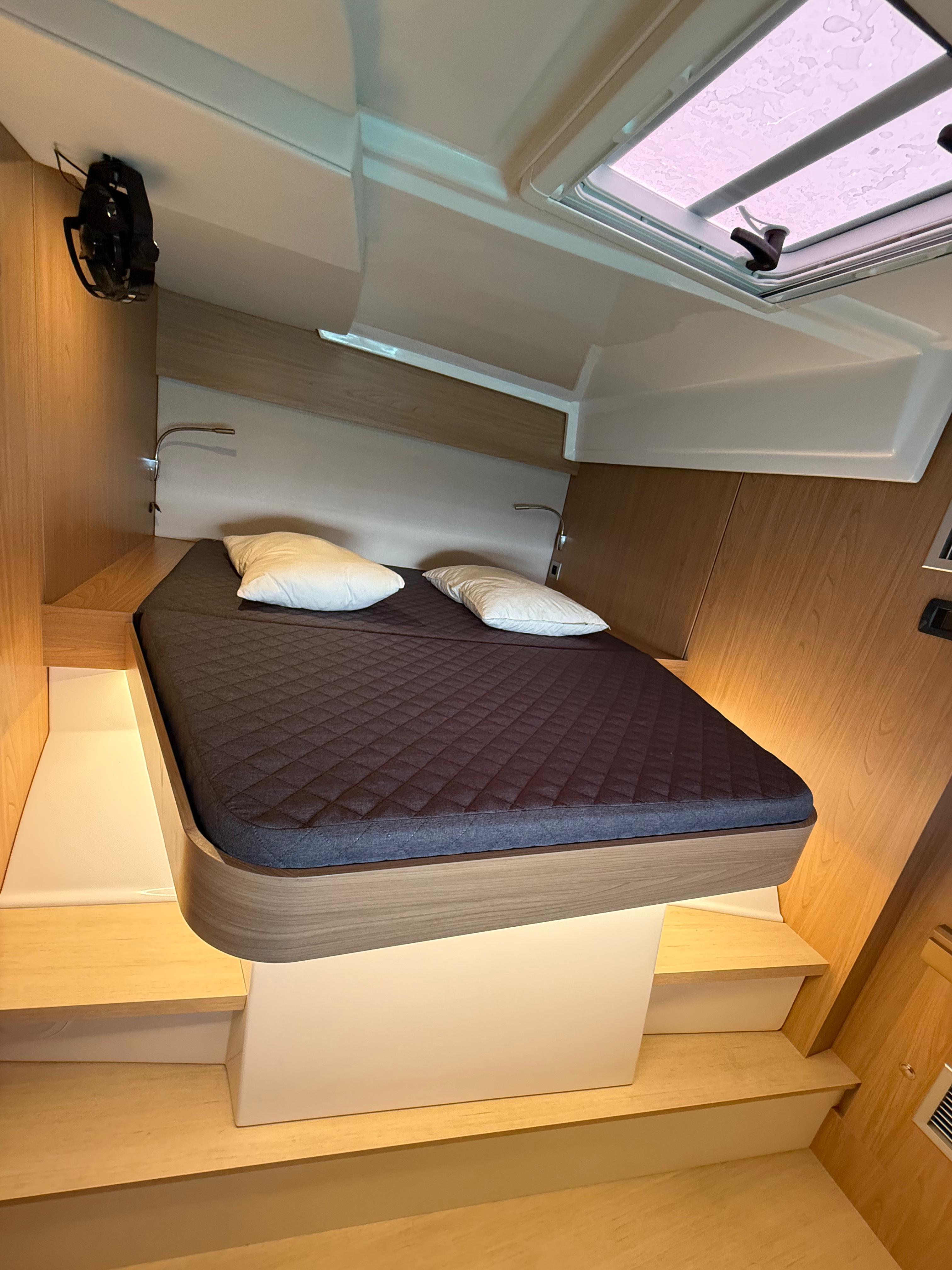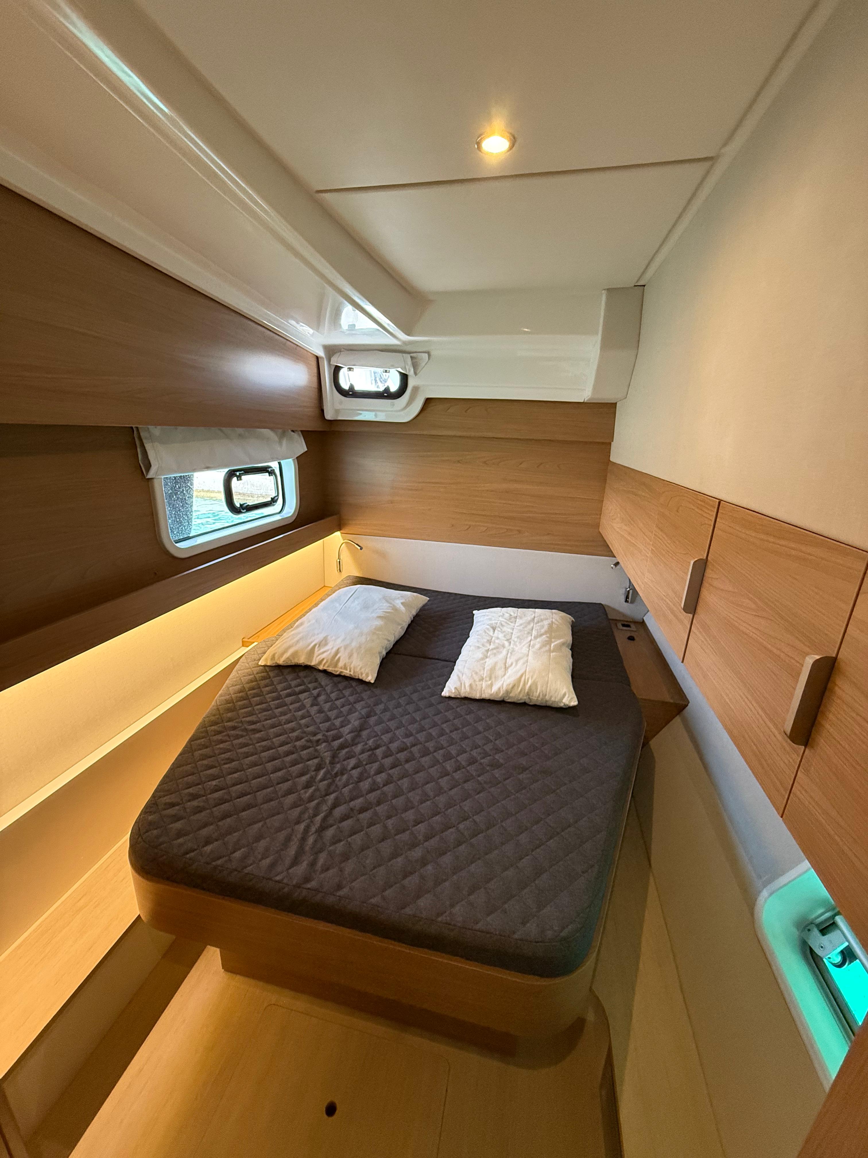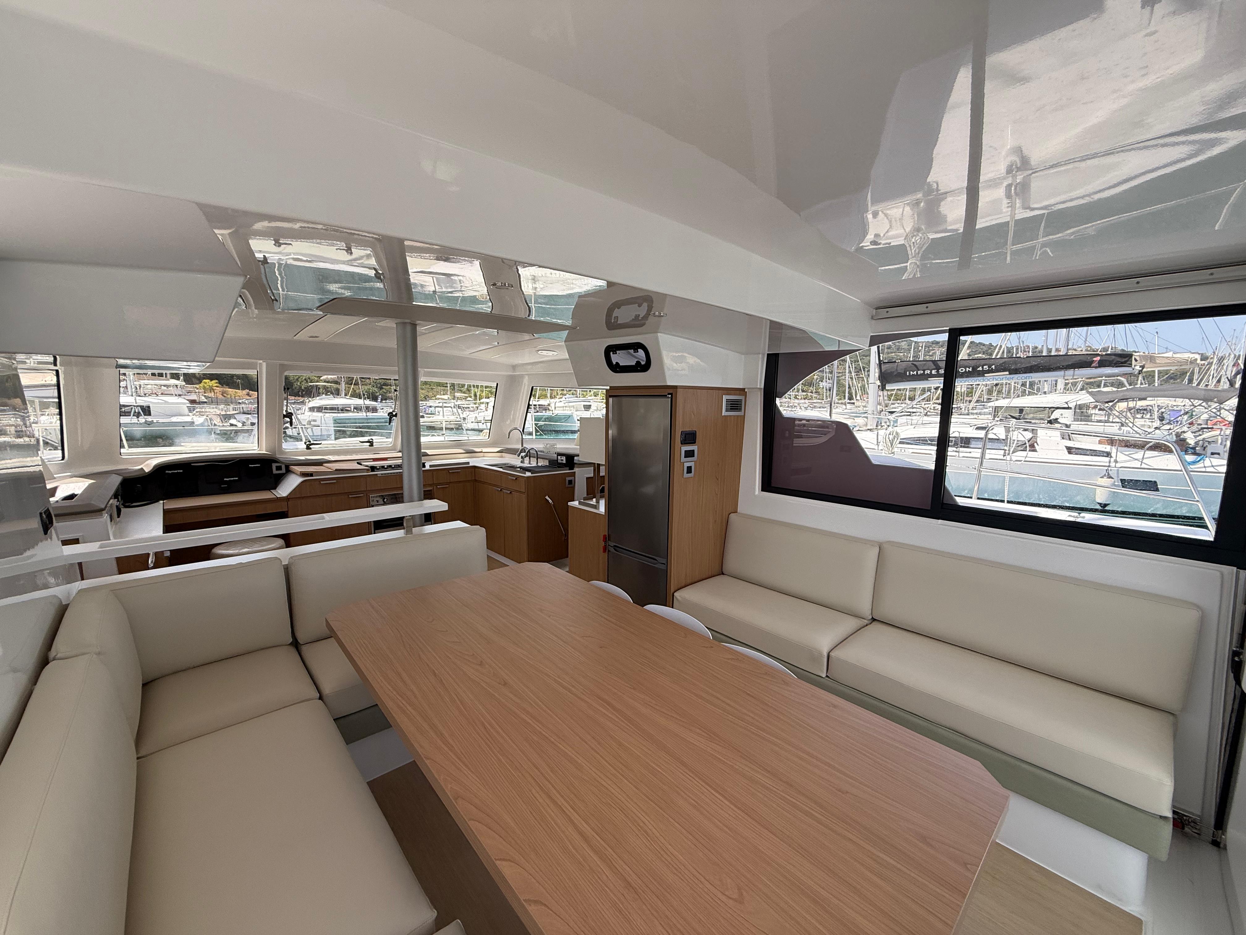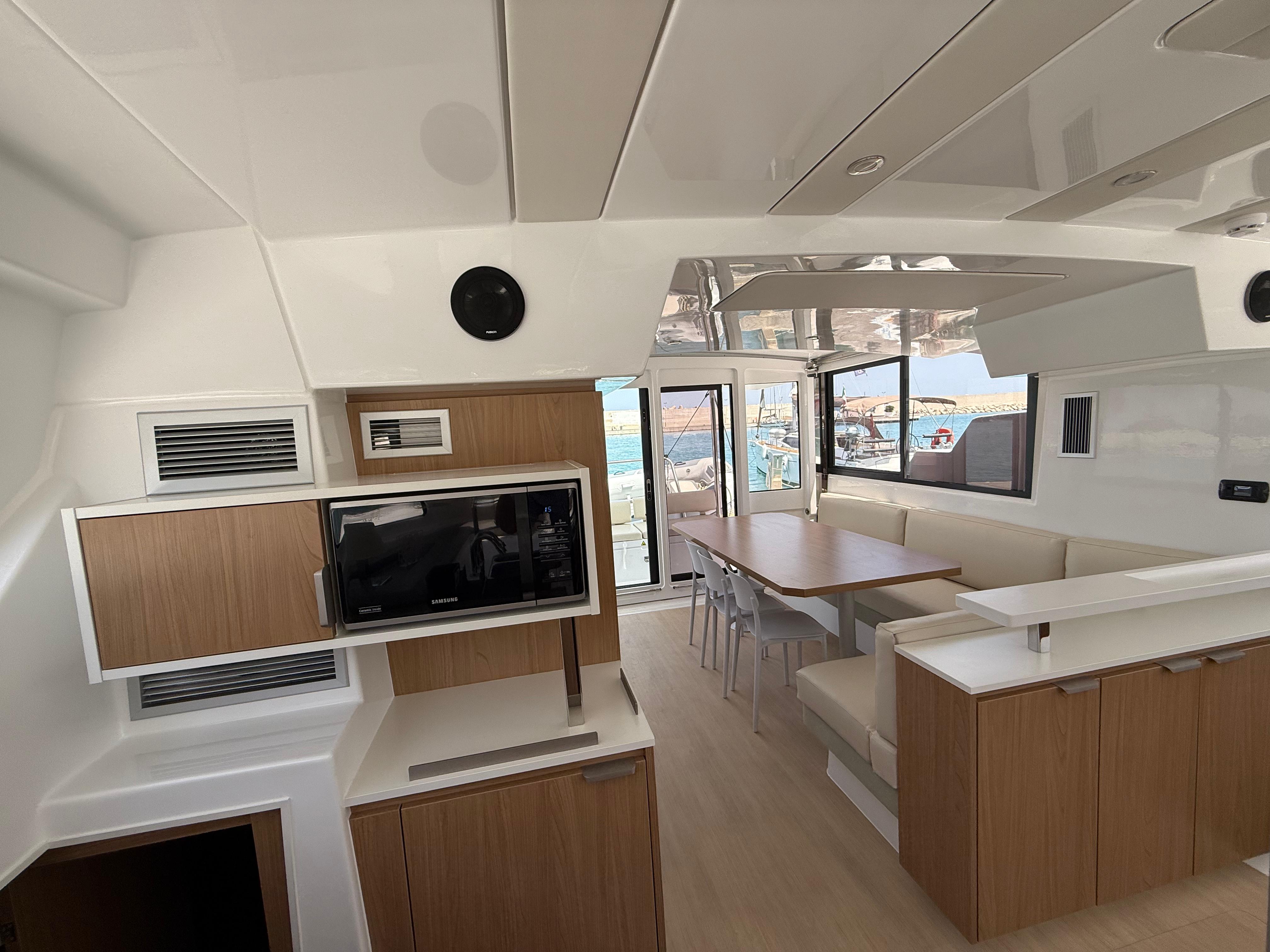 BiminiAudio Iphone/Ipod USBSliding curtainsWatermaker 12VCockpit speakersRadio with CD, USBShower outsideSprayhoodFreezerBarbecueSwimming ladderOven and 2 burner stoveConvertible dinetteKitchen equipmentAir Conditioning CabinsBluetooth speakersCockpit cushionsElectric WCGeneratorAir Conditioning DinetteAISSolar panelsSafety equipment for 10 peopleVHF radioCabin fansCockpit tableGas stove ovenFridgeMicrowave ovenLazy bagAutopilotElectric winchFlybridgeElectric windlassGPS plotterInverter