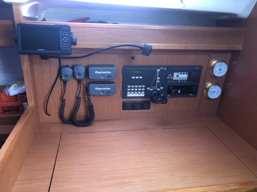 Cockpit cushionsAutopilotCompassGPSGPS chart plotterGPS chart plotter - cockpitLogge/Lot/SpeedNautical chartsNavigation setWind instrument/AnemometerBlack Water TankFire extinguisherFirst aid kitFlashlightSafety equipmentSet of toolsVHF radioAnchorBimini topCockpit/stern, outside showerDeck brushDinghyElectric anchor windlassFendersFolding cockpit tablePlastic bucketSprayhoodHot waterKitchen utensils (Galley equipment, cutlery)OvenRefrigeratorStoveInside showerFusion radioOutdoor speakersUSB