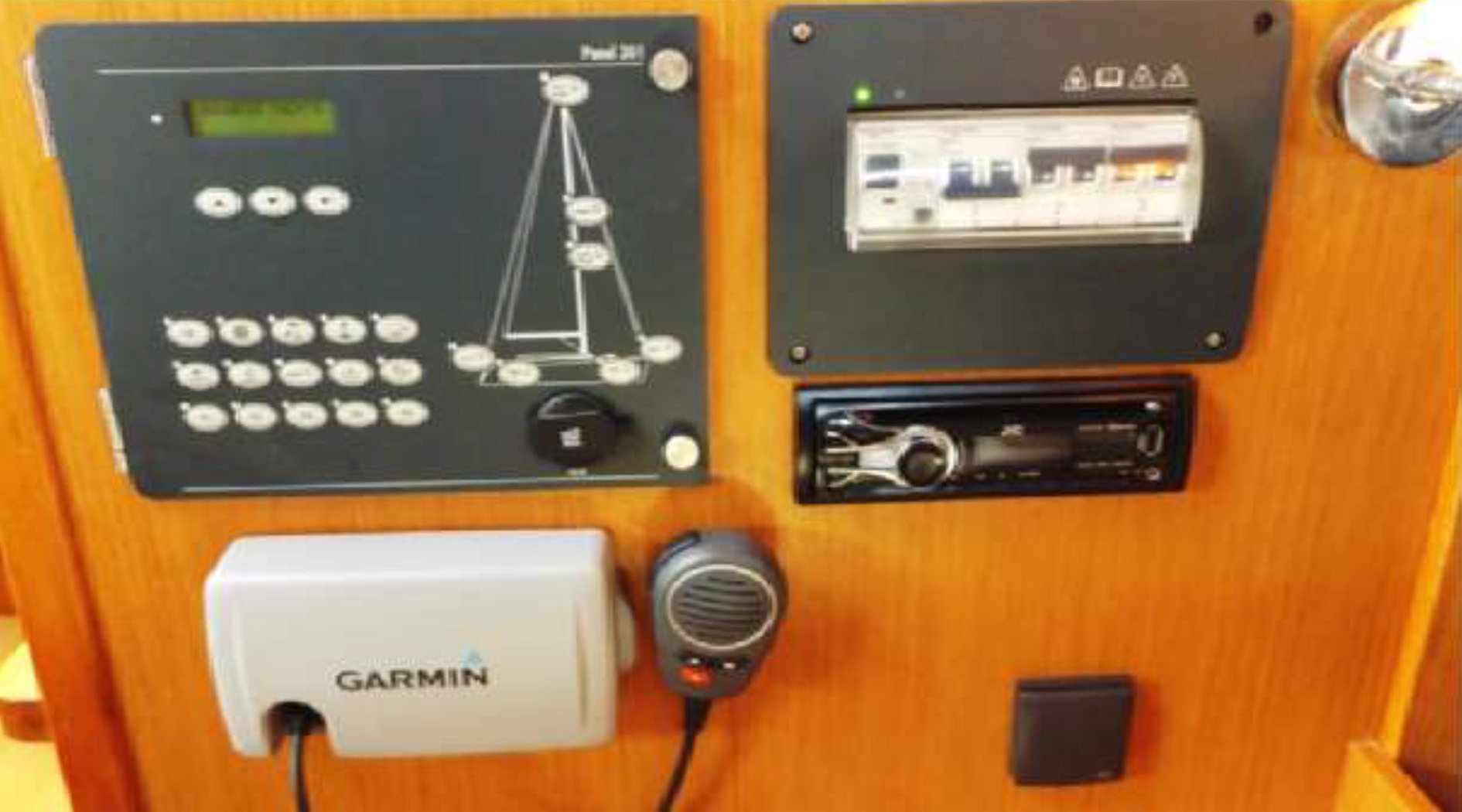 Cockpit cushionsLazy bagLazy jacksAutopilotCompassGPSGPS chart plotterLogge/Lot/SpeedNautical chartsNavigation setWind instrument/AnemometerBlack Water TankFire extinguisherFirst aid kitFlashlightSafety equipmentSet of toolsVHF radioAnchorBimini topCockpit/stern, outside showerDeck brushDinghyElectric anchor windlassFendersFolding cockpit tablePlastic bucketSprayhoodHot waterKitchen utensils (Galley equipment, cutlery)OvenRefrigeratorStoveInside showerFusion radioOutdoor speakersUSB
