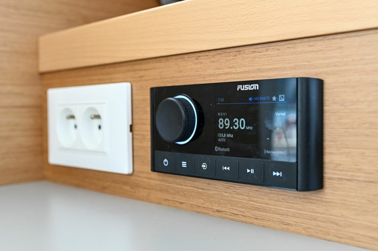 Cockpit cushionsLazy bagLazy jacksAutopilotCompassGPSGPS chart plotterLogge/Lot/SpeedNautical chartsNavigation setWind instrument/AnemometerBlack Water TankFire extinguisherFirst aid kitFlashlightSafety equipmentSet of toolsVHF radioSolar panelsWatermaker - desalinatorAnchorBimini topCockpit/stern, outside showerDeck brushDinghyElectric anchor windlassFendersPlastic bucketSprayhoodHot waterKitchen utensils (Galley equipment, cutlery)OvenRefrigeratorStoveElectric fans in cabinsElectric toiletInside showerFusion radioOutdoor speakersUSB