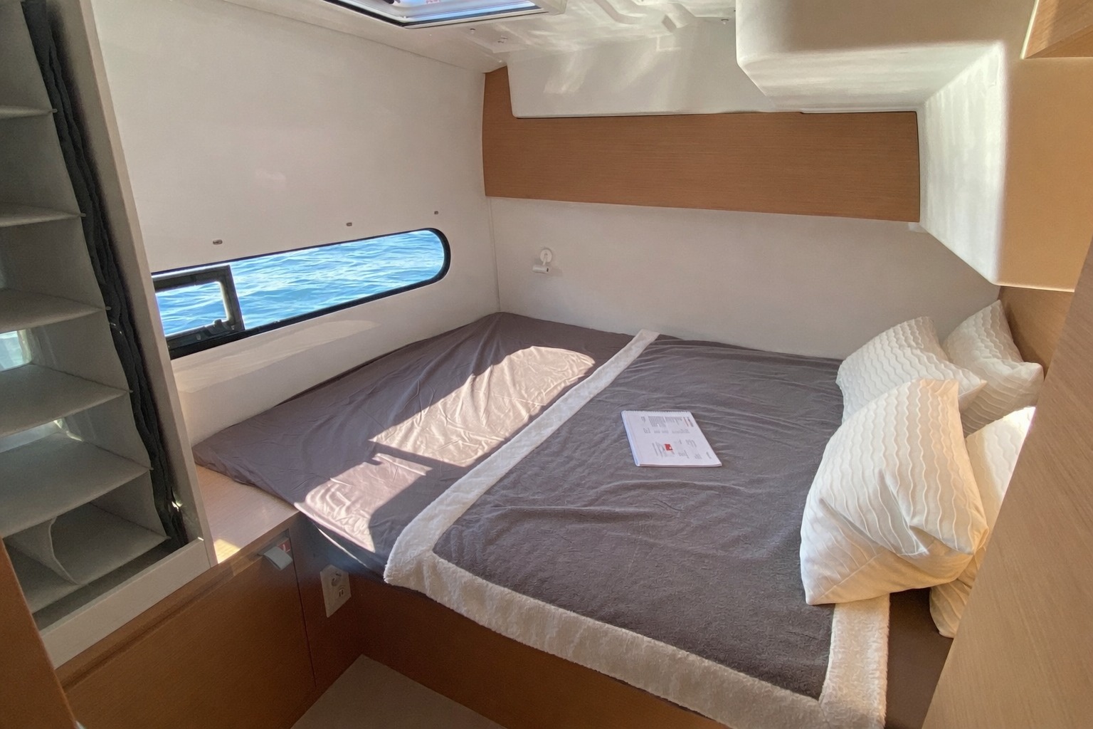 2x 130L front-opening fridges2x29HP saildrive with 3-blade fixed propellers2x gas cylinders (2.75 kg)child safety netelectric anchor windlass with wired remotehot/cold cockpit showerlazy bagdinghy1x rod holderfolding PVC gangway with storage bagfixed internal VHFautopilotlogfishfinderwindexwind stationweather stationtoolboxengine spare partsItalian flag safety equipment within 50 nm1x electric winchexternal cushions on seats and backrestsPulse Line versionwatermaker1x manual winchsolar panel systemGarmin chartplotter on starboard helm AIS 800 GarminLED lighting in cockpit cockpit table with extension, foldable to create a shaded lounge areabimini over the helms1x manual crew toilet 2x heads with electrical toilet and holding tankCode-0square top mainsail in grey laminate, full battensself-tacking jib1,15 mt2x fresh water tanks (600L total)2x fuel tank (400L total)Stand Up Paddle € 60,00/weekend - € 110,00/weekparking inside Marina di Nettuno € 17,00/dayextra towel set (face towel, body towel) € 30,00/double set - € 15,00/single setExtra bedding sheets pack € 15,00/single - € 30,00/doubleFusion Bluetooth stereo with internal and external speakersportable 220/12 V inverter220 V outlets + 12 V outletfanstwo-burner stovegas ovenpots, pans, dishes, and kitchen utensilsUSB outletsinverter 2 KWelectric seawater pumpcurtains in salonconvertible salon