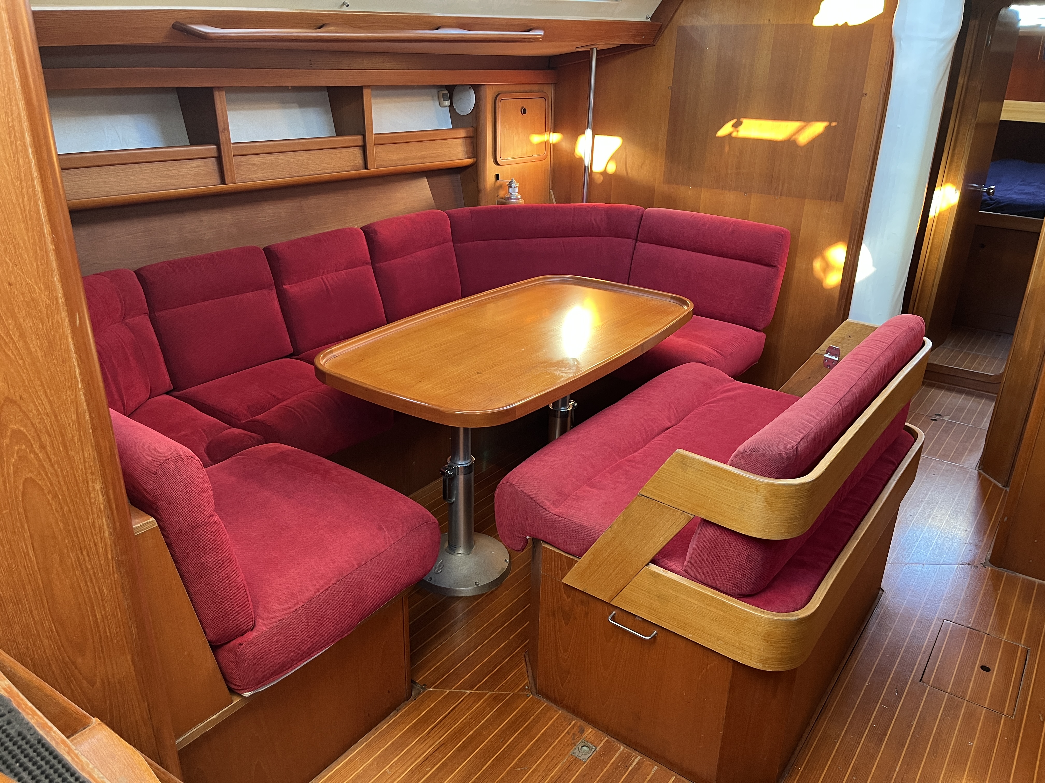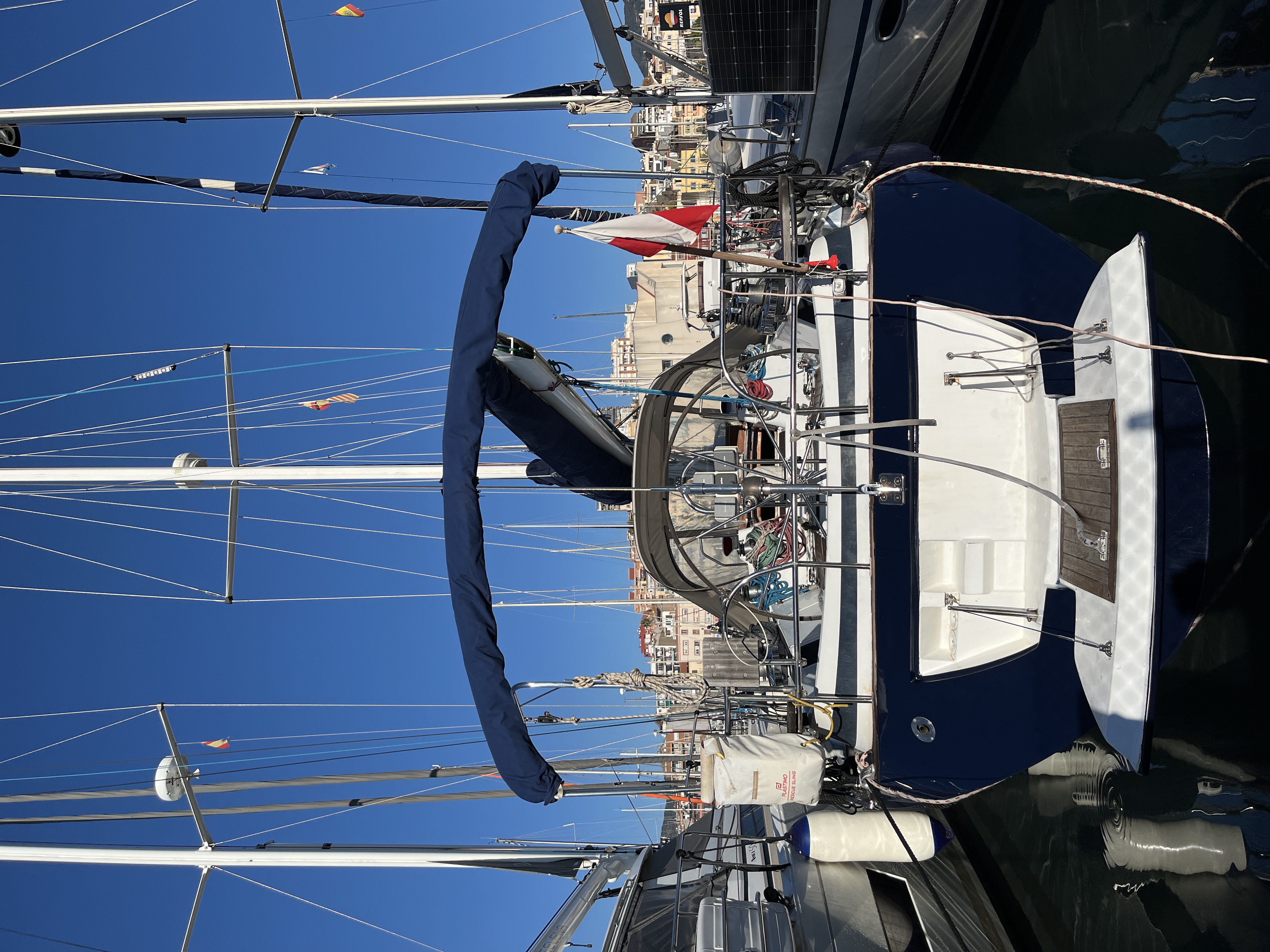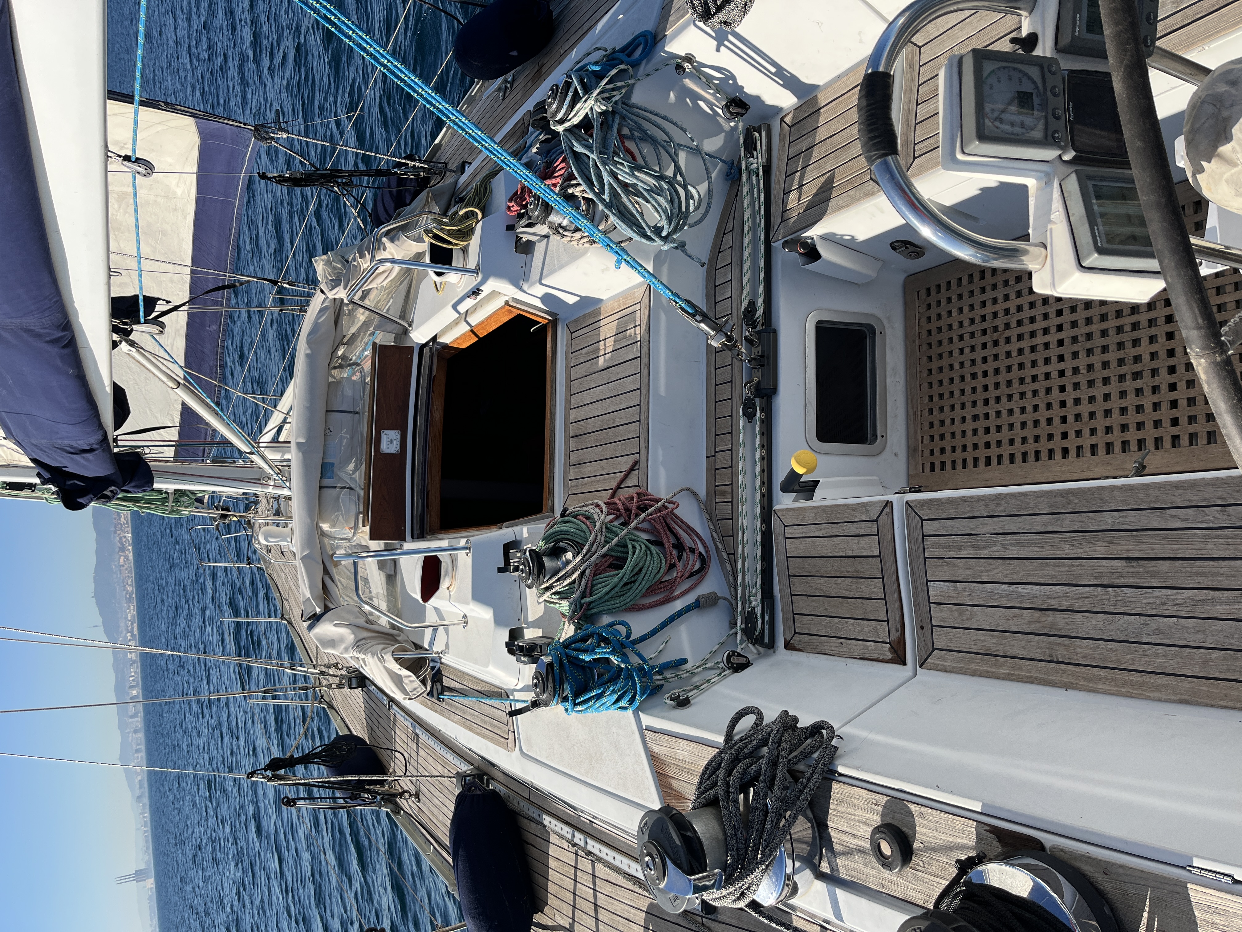 Electric Halyard WinchFull batten Main SailFurling GenoaTeak DeckBiminiSprayhoodLiferaftBathing ladderElectric windlassAutopilotPlotter in the cockpitPlotter at chart tableVHF-Radio with DSCSpeedometer&depth sounderWind equipmentbattery charger12V refrigeratorCockpit speakersCockpit shower with hot waterTeak cockpitBow thrusterStove with ovenElectric anchor winchElectric fridgeNautical chartsCompassGennaker equipmentAIS