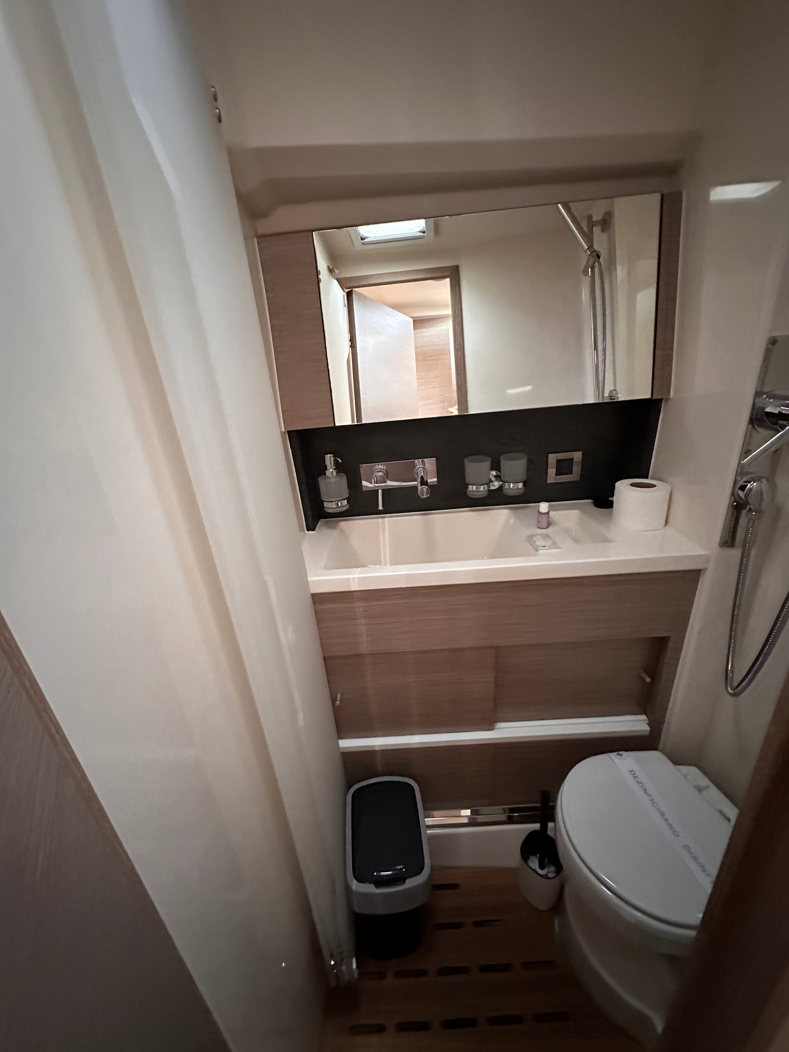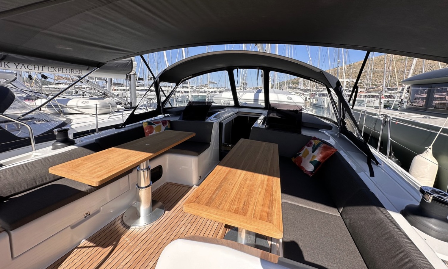 Cockpit cushionsCockpit/stern, outside showerAnchor with chainElectric anchor windlassBimini topGangwaySpare anchorDinghySprayhoodCockpit tableFendersMooring ropesRadio CD mp3 player + USBWi-Fi InternetOutside speakersRefrigeratorKitchen utensilsCoffee machineElectric toiletBed linenPillowsBlanketsTowelsGPS chart plotterNautical chartsCompassBow thrusterHarbour guidesDivider, nautic chartWind instrument/AnemometerNavigation setAutopilotLife jacketsDistress signalsLife belts (Safety harness)First aid kitFire extinguisherLiferaftHorseshoe lifebuoyVHF radioGeneratorInverterHeatingBattery chargerShore connection 220 VAir condition