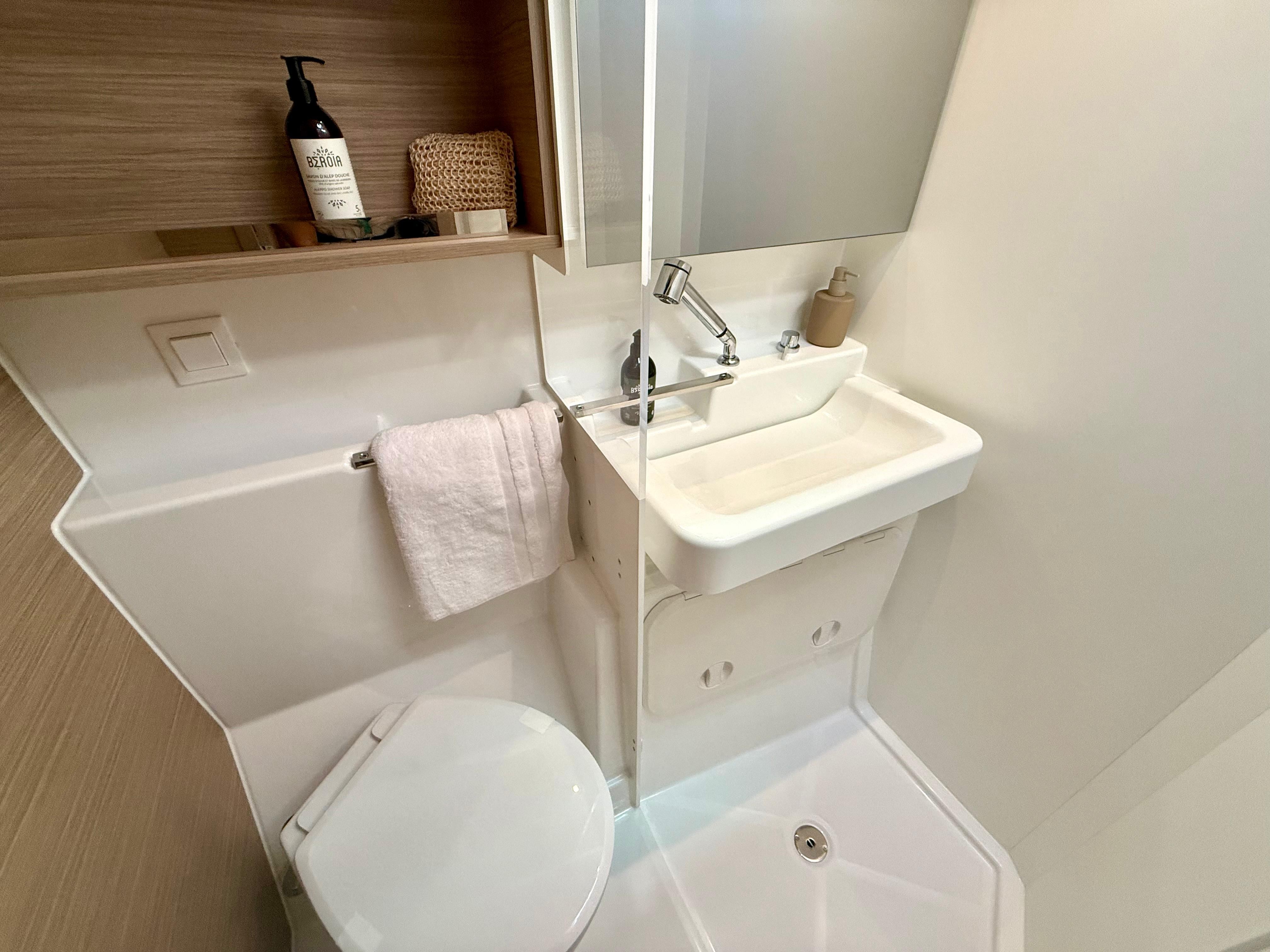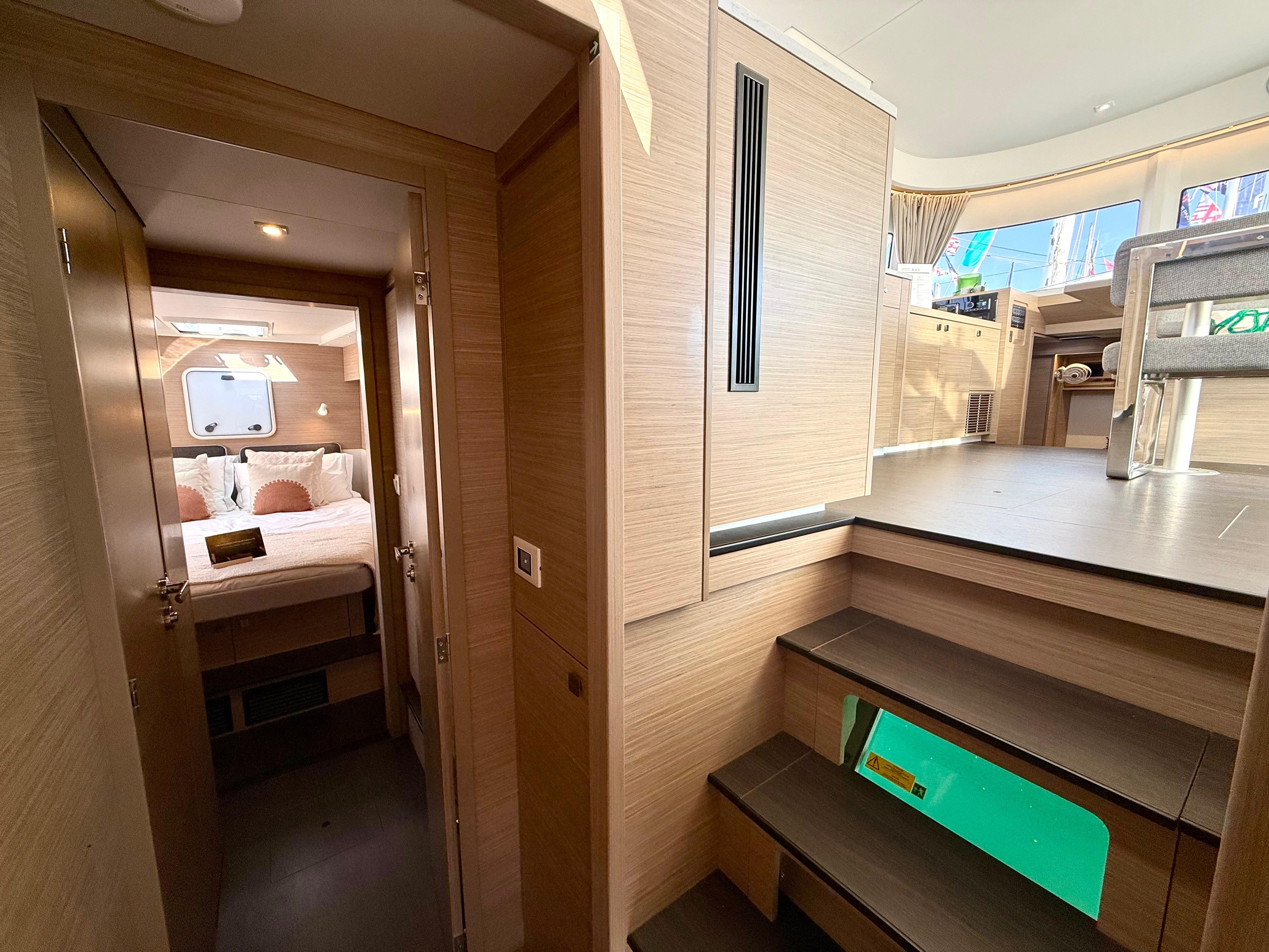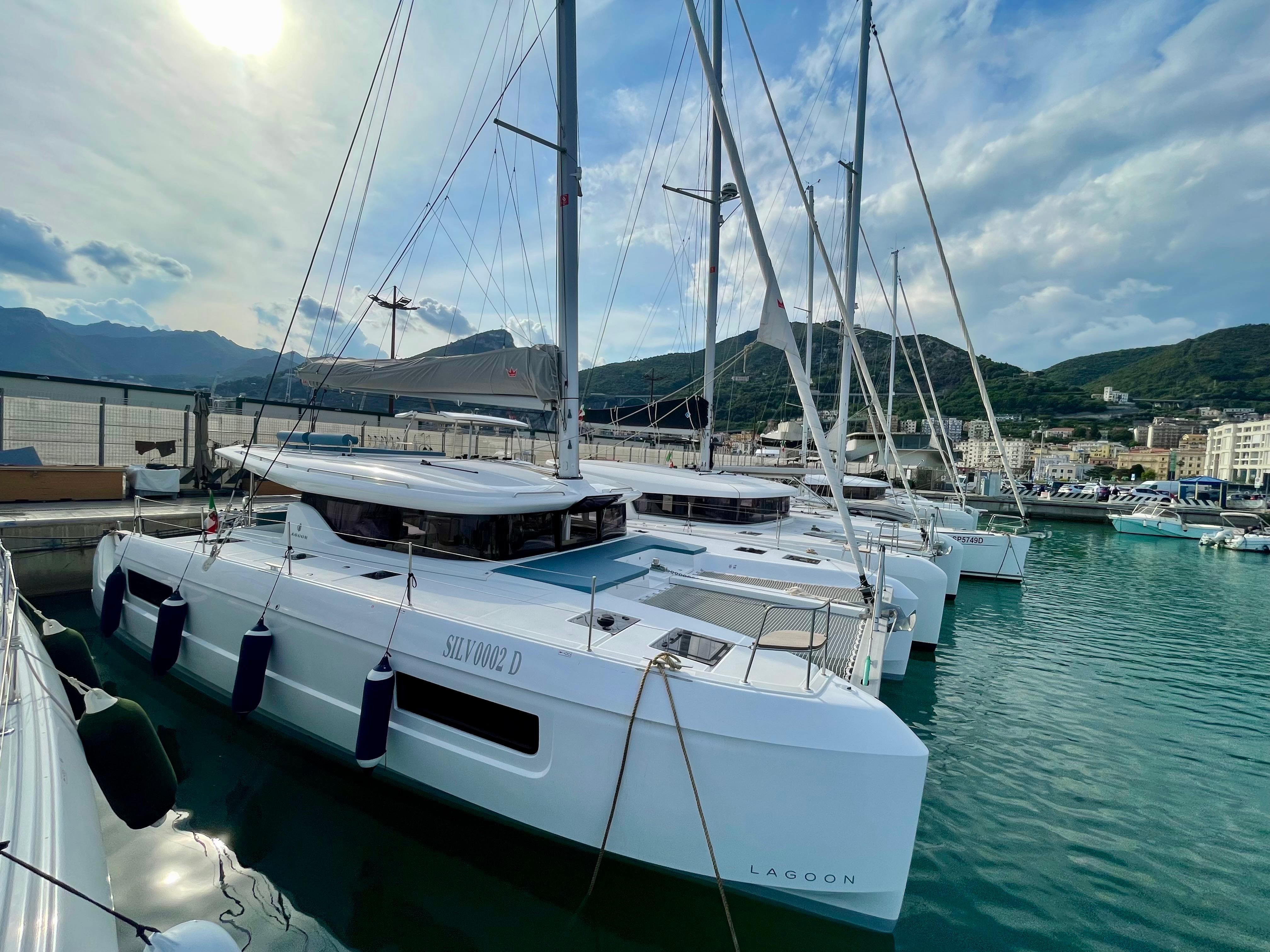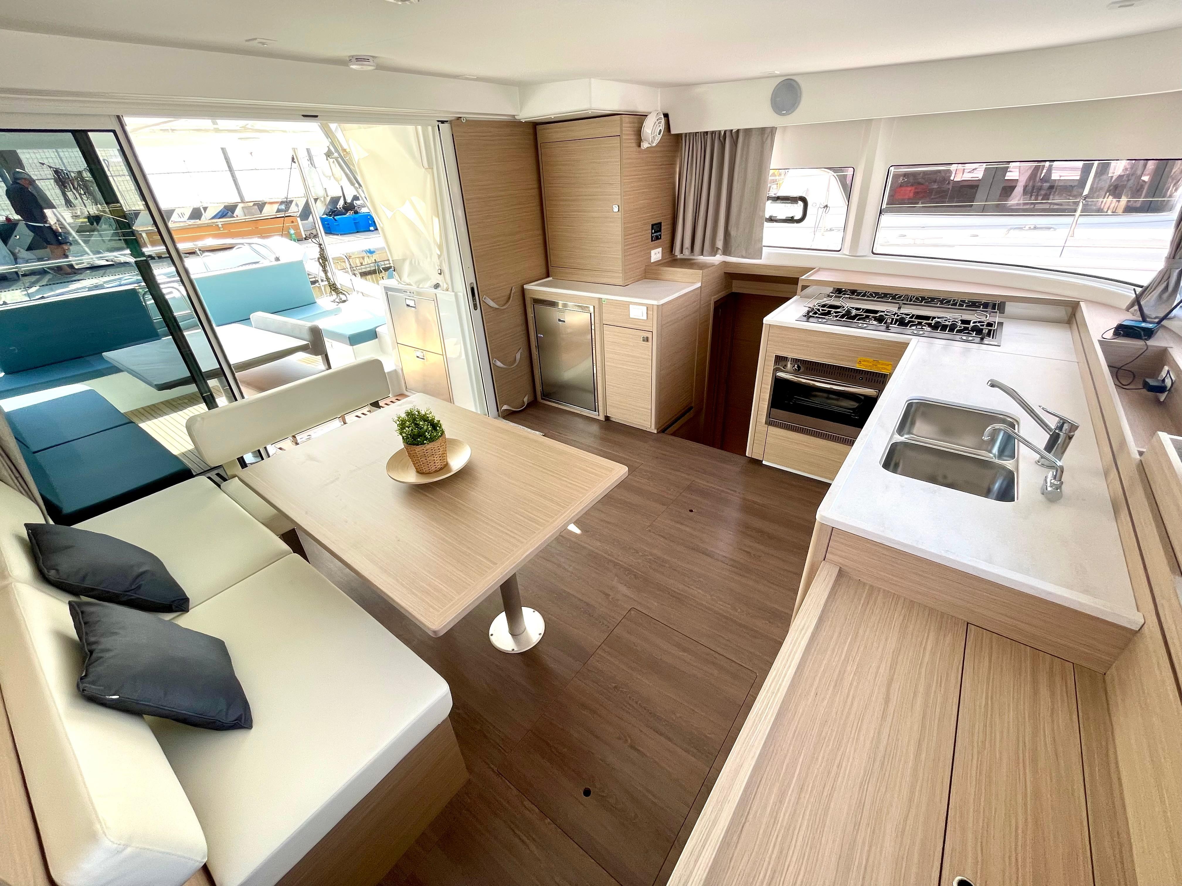 AutopilotPlotter in cockpitUSB SocketGPSRadio - cd players - bluethootSpeakers in Cockpitelectrical winch 50.2 at helm stationanodized aluminium mast and boom on the roofgenoa 37 mqwith Uv protective band1700W/12V electrical windlassCockpit fridge 150Lcomposite bimini, windscreen and enclosuredNatural wood on aft cockpit floor and transomswindlass remote control at helm station with chain counterAdditional aft portholes in aft cabins with sun curtainsAdditional pullman berth in aft port cabin (berth dimensions: 1.80x0.74m)Air conditioning in salon and cabinsConvertible dinetteCurtains and blinds in all cabinsfans in salon and cabinslateral portholes in salonSeparate shower with PMMA door il all headsinternal fridge 12v - 130LL-shaped galleyraymarine navigation packDINGHY 3,40mtanchor 25kg, 85 m anchor chain D12electric toilets in all cabinsindirect lighting in cabins and salonelectrical circuit 220V6 service batteries 95Amp + battery controller 50AmpMonitoring display Navicolorusb sockets in the cabinsdouble helmseat bench and wooden steps for roof accessS/steel dinghy hoist system &manual winch1 automatic immersed bilge per hull, with alarm signalinverter 12/220V 50HZ - mastervolt 2000 kwagenerator genset1 manual bilge pump per hullblack water circuit 4x80L