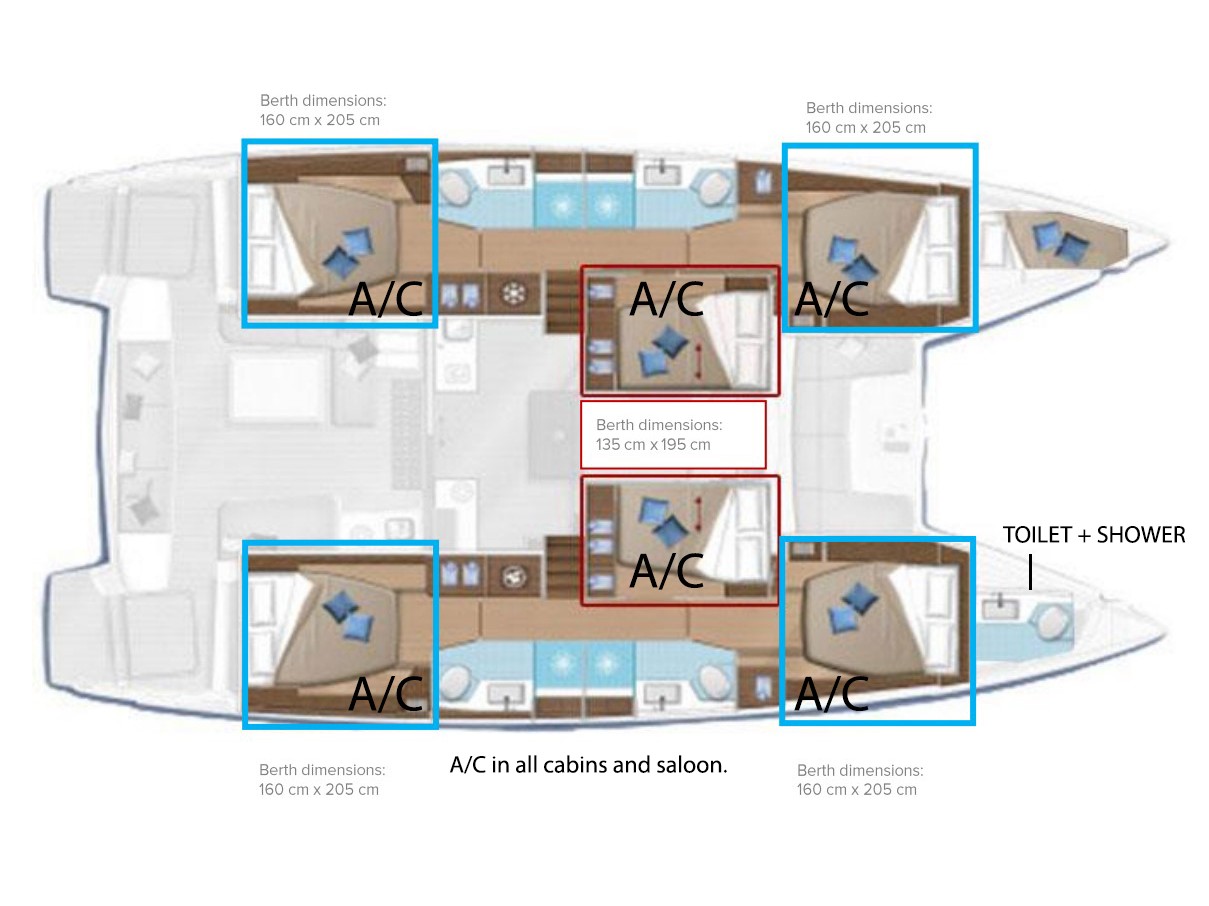 Winch - manualTeak cockpitGangway Electric / HydraulicSwimming platformTender davitsGPS Plotter FlybridgeTridata instrumentAutopilotAISVHF radioWinch - electricRadarCockpit tableNautical chartsFendersCockpit cushionsAC - cabinsAC - salonBattery chargerFans in cabins & saloonFridge in cockpitGeneratorWatermakerTender Highfield (3,4m) + outboard engine Honda 20HPFreezer 5LBeach towelsBedlinenCoffee machineGalley equipmentHair dryerIce maker Refrigerator (l)Stove and ovenTowelsLazy bag for standard aluminium boomWinter tentSummer tent - sun shades in cockpitSprayhoodFull battened mainsailFurling GenoaHard top on flySea Bob F5BluetoothSpeakers on flybridgeWIFISUPRadioUSB sockets - salonUnderwater lights220V socketsUSB sockets - cabinsSpeakers - cockpitSpeakers - saloonSnorkeling equipment