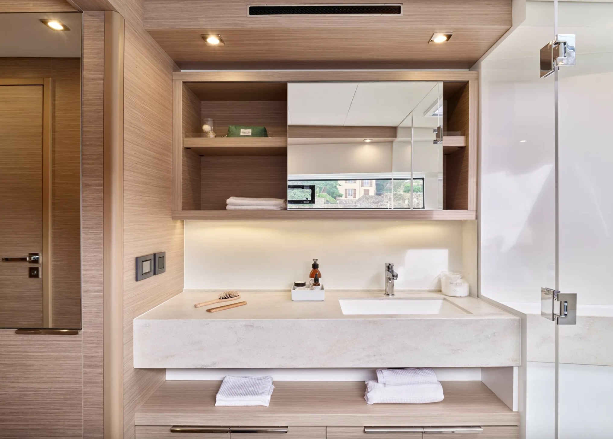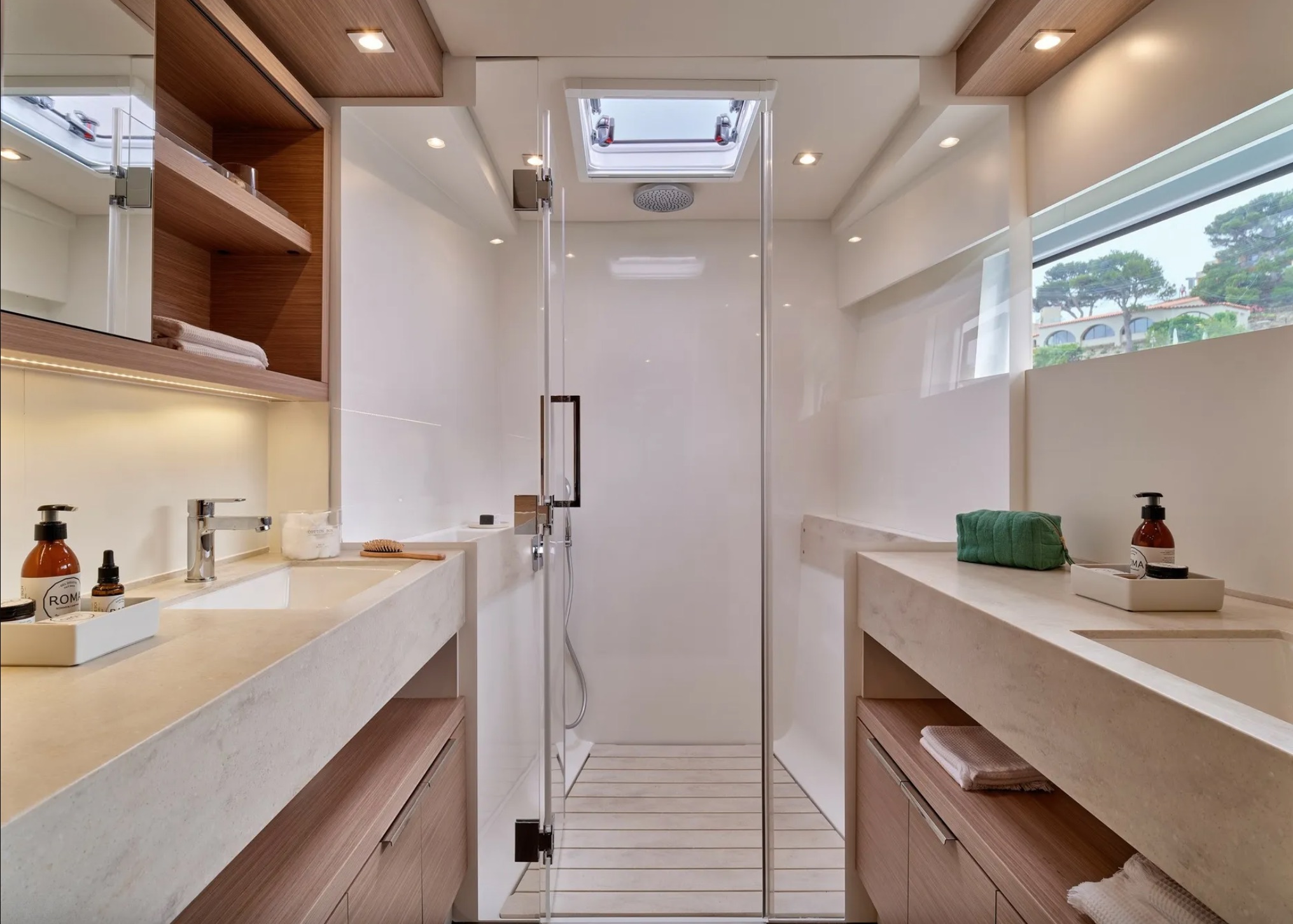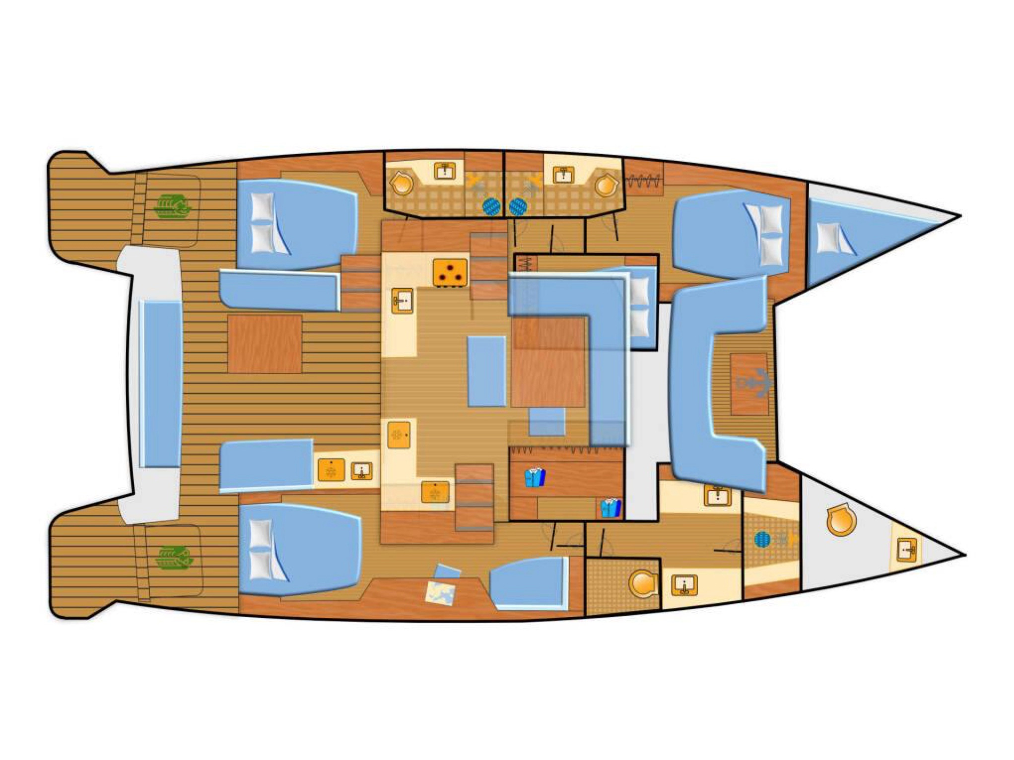 Outside cushions (bow, flybridge, cockpit)SunshadesElectric halyard winchElectric main sail winchLazy jacksGenoa (manual)AutopilotDepthsounderGPS chart plotterPilot bookWind instrument/AnemometerWindexEPIRB-Distress radio beaconsVHF radioAir Conditioning2 x Batteries - extraBaterry chargerGeneratorInverterShore connection 220 VUSB socketsWC pump - electricWatermaker2 x Bilge pump - MechanicBimini topCockpit table - woodenDinghyElectric anchor windlassFendersHydraulic gangwayMain anchor - 45 kg with 80 mOutboard engine - 20HPSpare anchor (Reserve, Auxiliary anchor) - 20 meters chainSwimming ladderGas bottlesHot waterKitchen utensils (Galley equipment, cutlery)4 x Refrigerator + 1 FridgeElectric fans in cabinsBluetooth playerRadioSnorkeling equipment