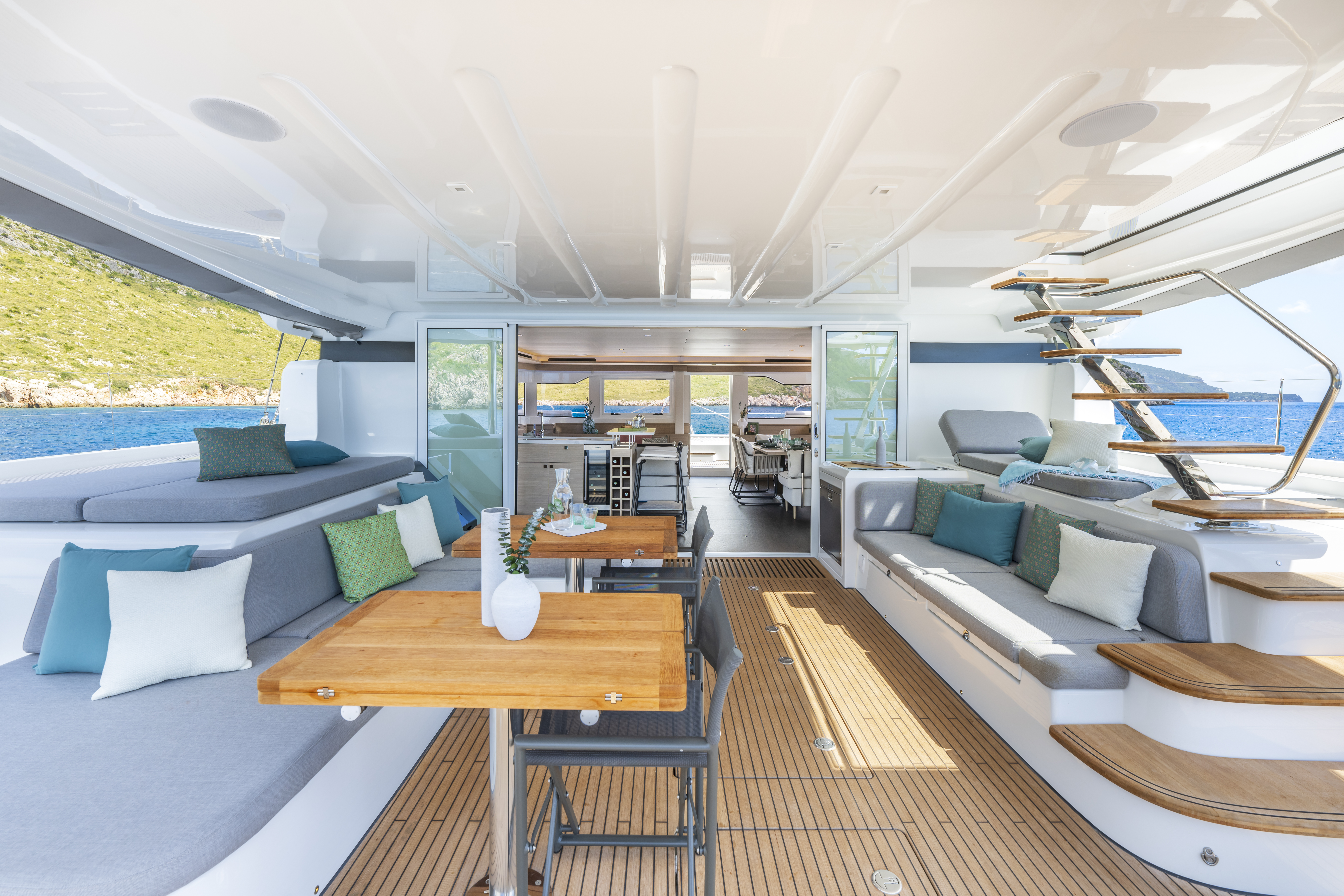 Dinghy Highfield SP420 + Honda BF 40E outboard engineRaymarine cameraIce-maker in flybridgeTeak in cockpitFridge in FlybridgeTeak on FlybridgeHydraulic GangwayFlybridge Led LightsUnderwater SpotlightsFridge in cockpitDeck ShowerCushions in aft, forward and flybridgeSolar Panels Aluminium canoe boomObligatory standard safety equipment SeascooterSUPWakeboardBanana boatFishing KitAnchor chain Bow thrusterRaymarine InstrumentsRadarElectric winchesFull Batten Mainsail (Lazy Bag)Code 0Yanmar 195 hpIce-maker in saloonMoquette in master cabin and saloonSink in flybridgeFans (all cabs)USB (all cabs)A/C (all cabs and saloon)HiFi Speaker in saloon and cockpitHiFi Speaker in FlybridgeFridge and freezer in kitchenOvenHydraulic platform for sunbathing and divingJuicerTenderlift XLBBQInverterWatermakerIlly coffee machine MicrowaveCooker with oven Dishwasher JuicerElectric kettle ToasterGeneratorElectric WCWasher-dryer Wine cellar Ping-pong table