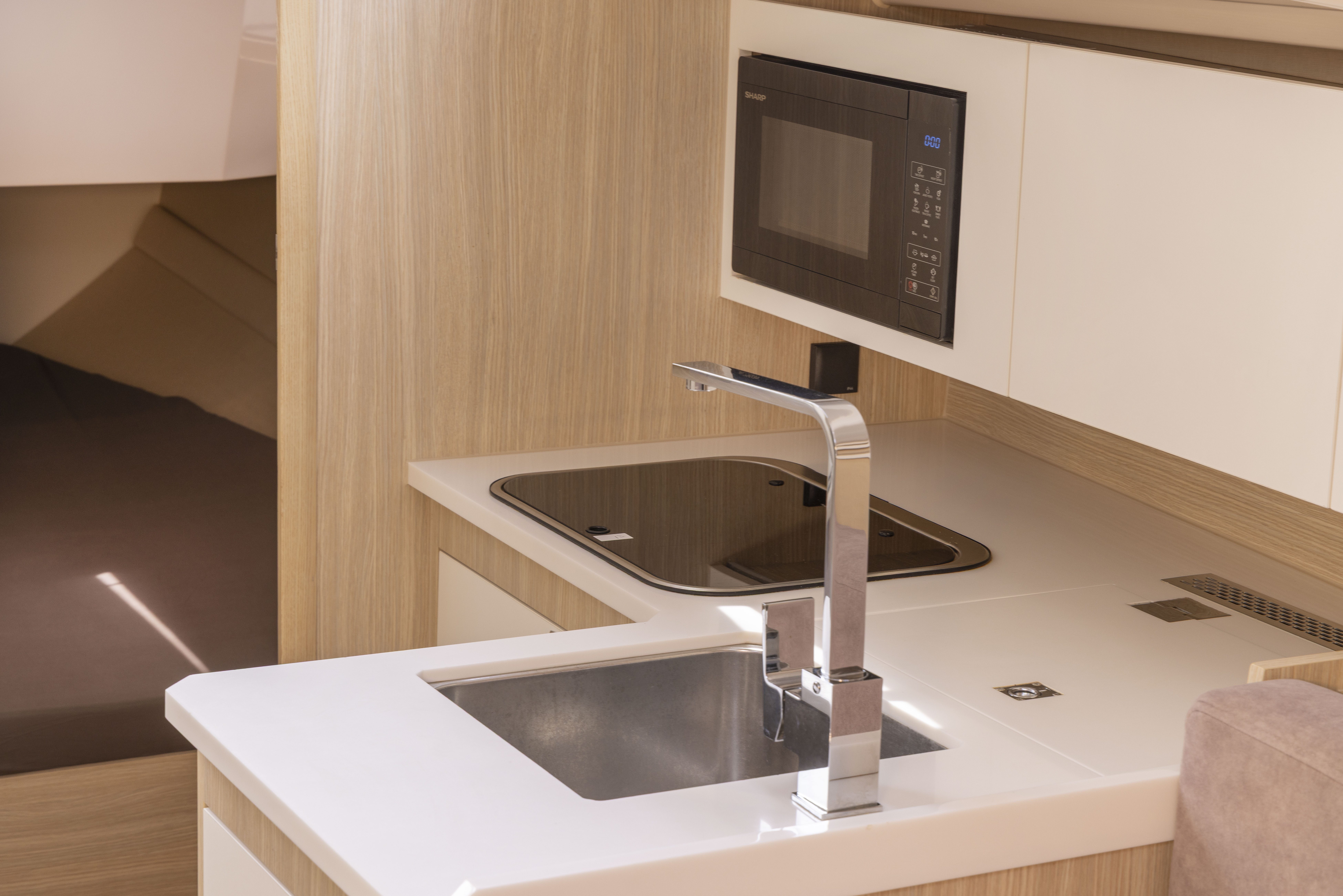 Bow thrusterLazy Jack230 V installationLife jackets LifebuoySteering wheelEcho sounderBattery chargerOutboard ladderFire extinguisherShower in the cockpitFridgeHeatingMicrowaveKitchen equipment (cutlery, utensils, crockery ...)Gas stoveTVRadio (CD or MP3)Mobile phone charging socketPaddles and boat hook