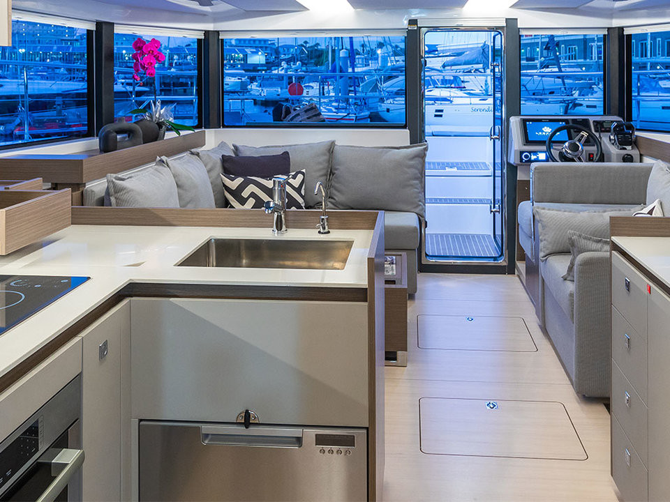 Cockpit tableLockerCompassBiminiLiferaft lockerHardtop coverElectric grillLED floor lightingWetbarSpring linesFendersMooring/dock linesLifejacketsSafety harnessesBellFlare kitBinocuolarsFire extinguisherSteering wheelSecondary anchorStainless steel rollerSelf-draining anchor locker w/ coverPrimary anchorElectric windlassSwimming ladderCockpit showerHorseshoe buoyFlag pole holderElectric bilge pumpManual bilge pumpGPS PlotterFuel gaugeAbsorbed Glass Matt (AGM) batteriesAlternator12V battery isolatorChart plotterWind dataAutopilotVHF radioTVRadio CD player/mp3Cockpit speakersDVDShore power cableHouse battery bankUSB ports in cabinsBattery chargerMultifunction touchscreenDepth sounderSolar panelsUSB socket at switch panel, doubleUSB socket at chart table, doubleUnderwater lightsMicrowave ovenRear view cameraFog hornFixed propellerFuel filterEngine room ventilation fans and ductingFuel deck fillersWater separator
