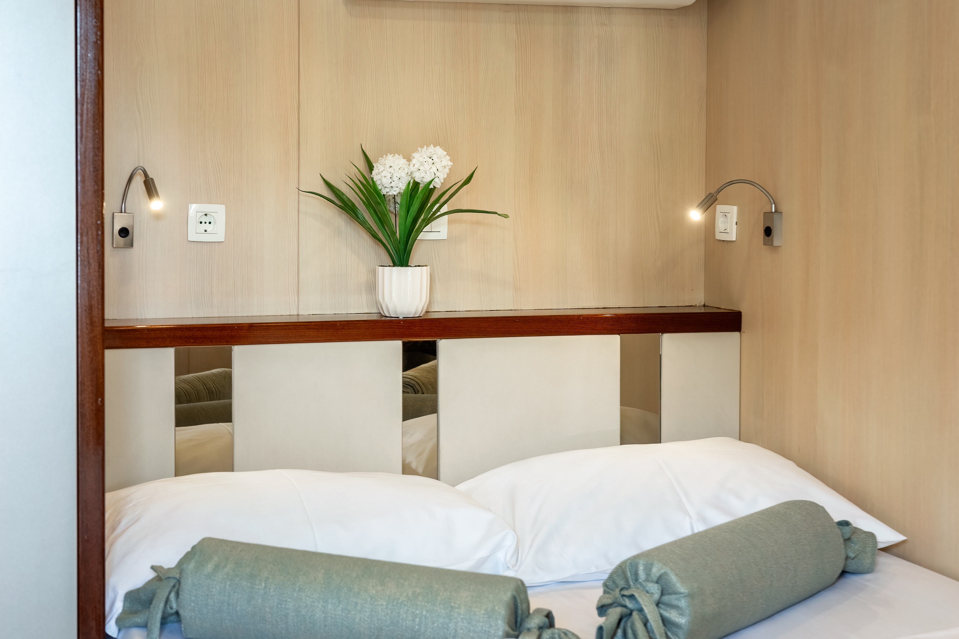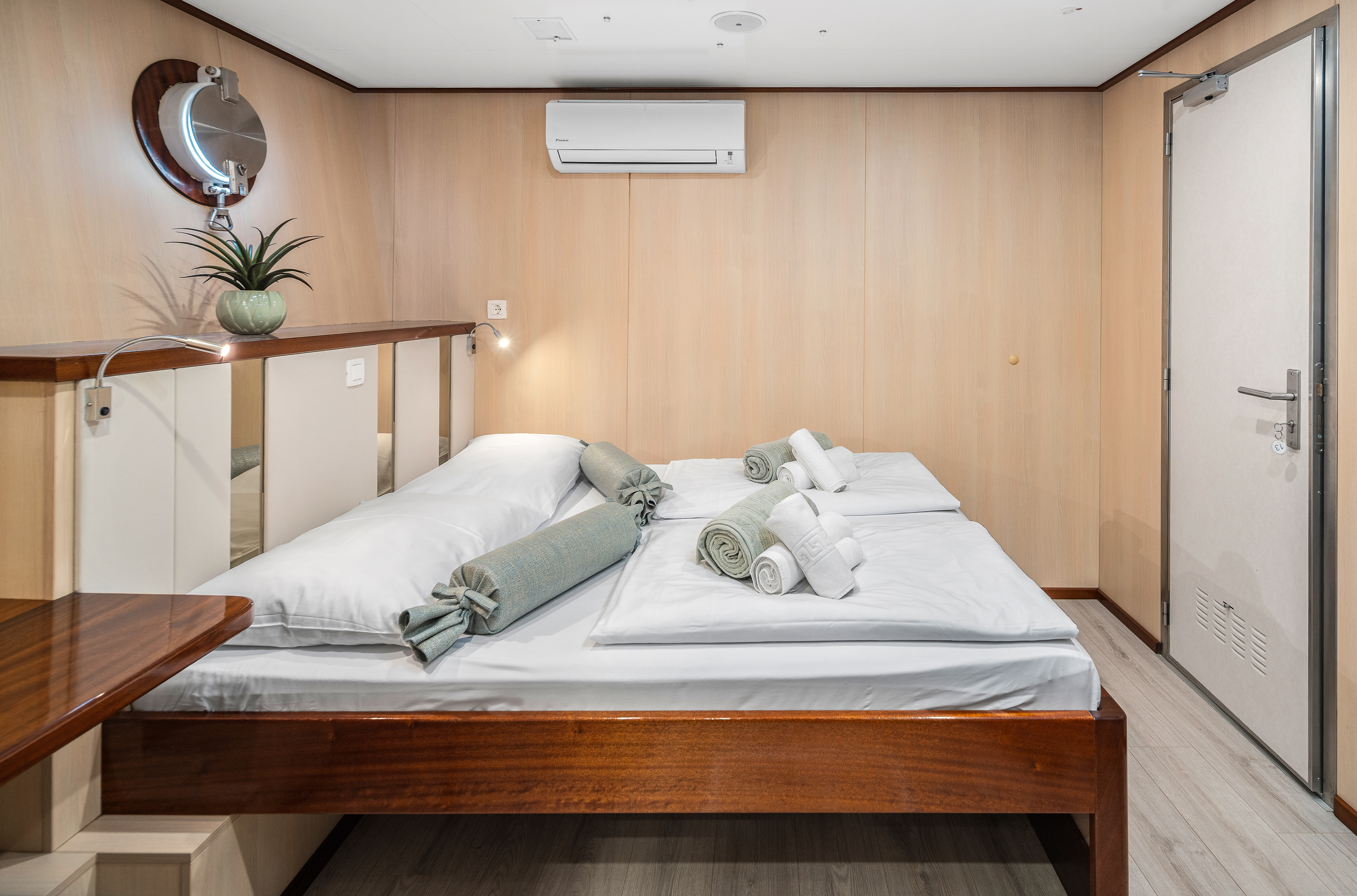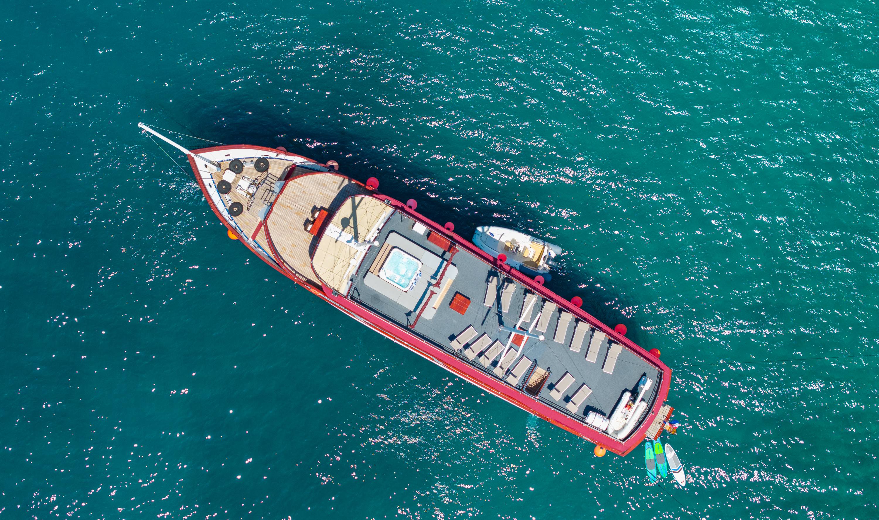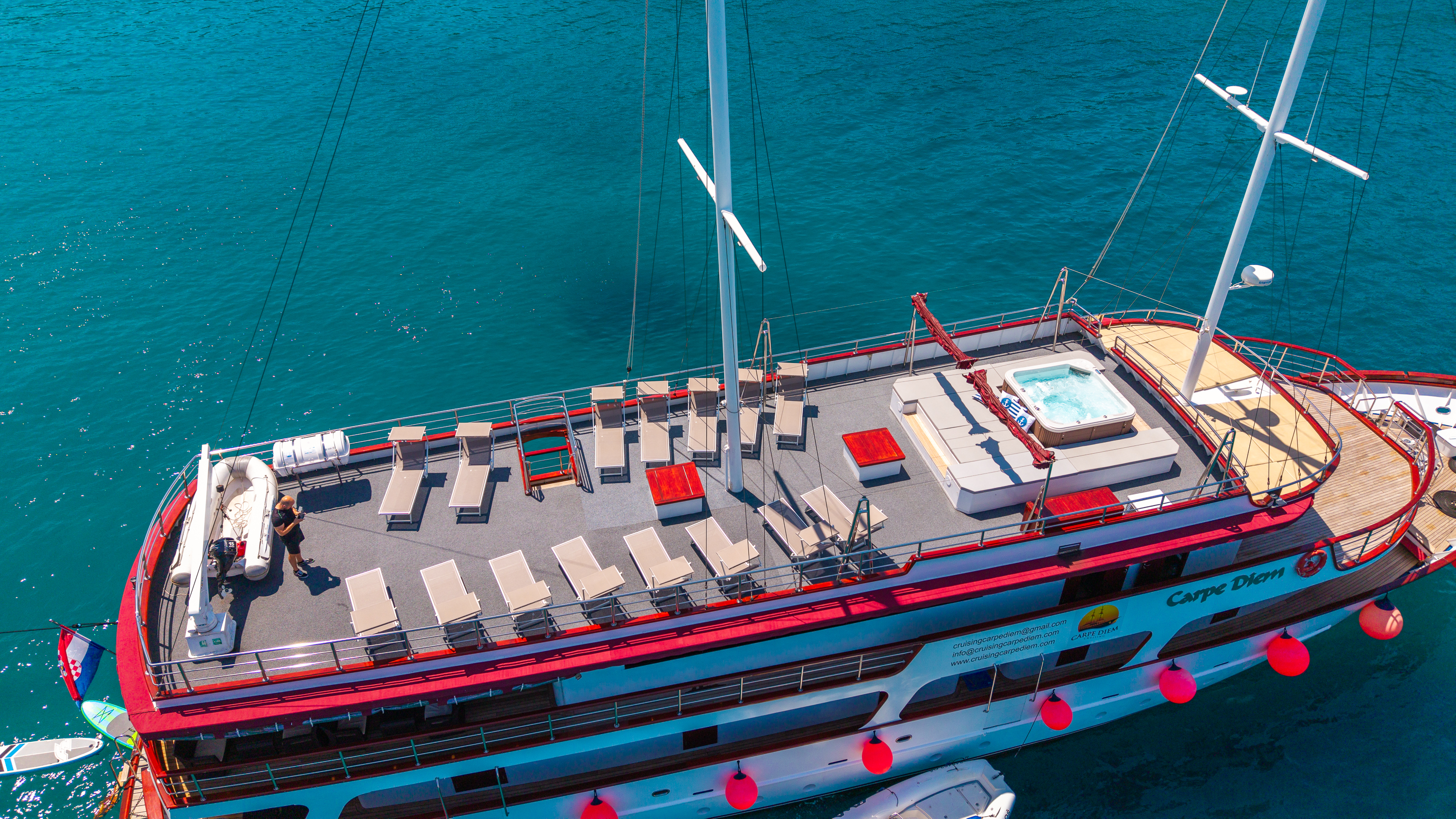 Twin bed cabin (with pullman)Air conditionDouble bed cabinBed linenTowelsSwimming platformAft deck loungeSmart TVRoom ServiceStainless steel boarding ladder with irocco stepsHidraulic steering system with steering position at bridgeSun awningSun deckshowerBoard gamesWi-FiSunbathing cushionsSunbathing areaCompasTrue heading autopilotEcho sounderSamyung color radarStandard solas navigation lightsTwo horseshoe bouys with warning lightsSolar life jackets for each passengerAutomatic inflatable liferaft for 50 peopleSmoke detectors in each cabinCentral alarm for fire equipmentPortable fire extinguishers for corridors and salonFire extinguishers in the engine using aerosolVHF radio DinghySUPSnorkel and Fishing gearCinema with a projector on the sun deckToorx Race CrossSpinning BikeProfessional Diving equipment – (extra charge)