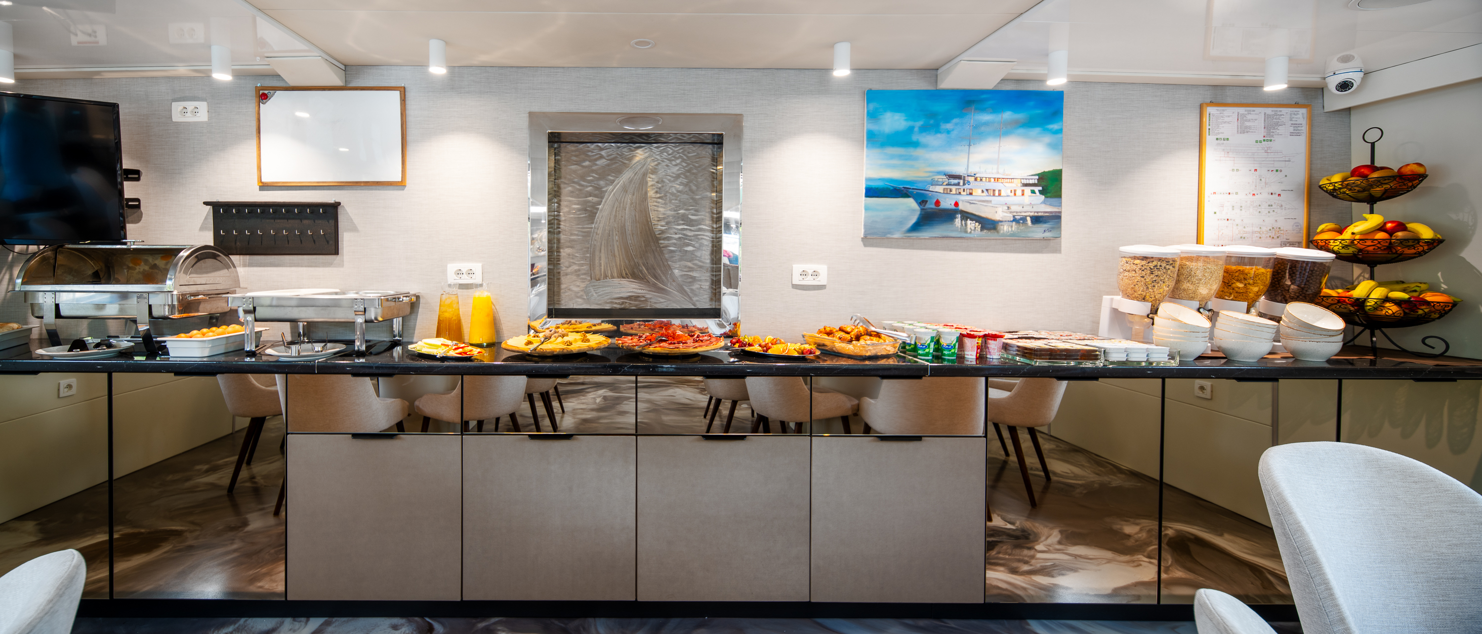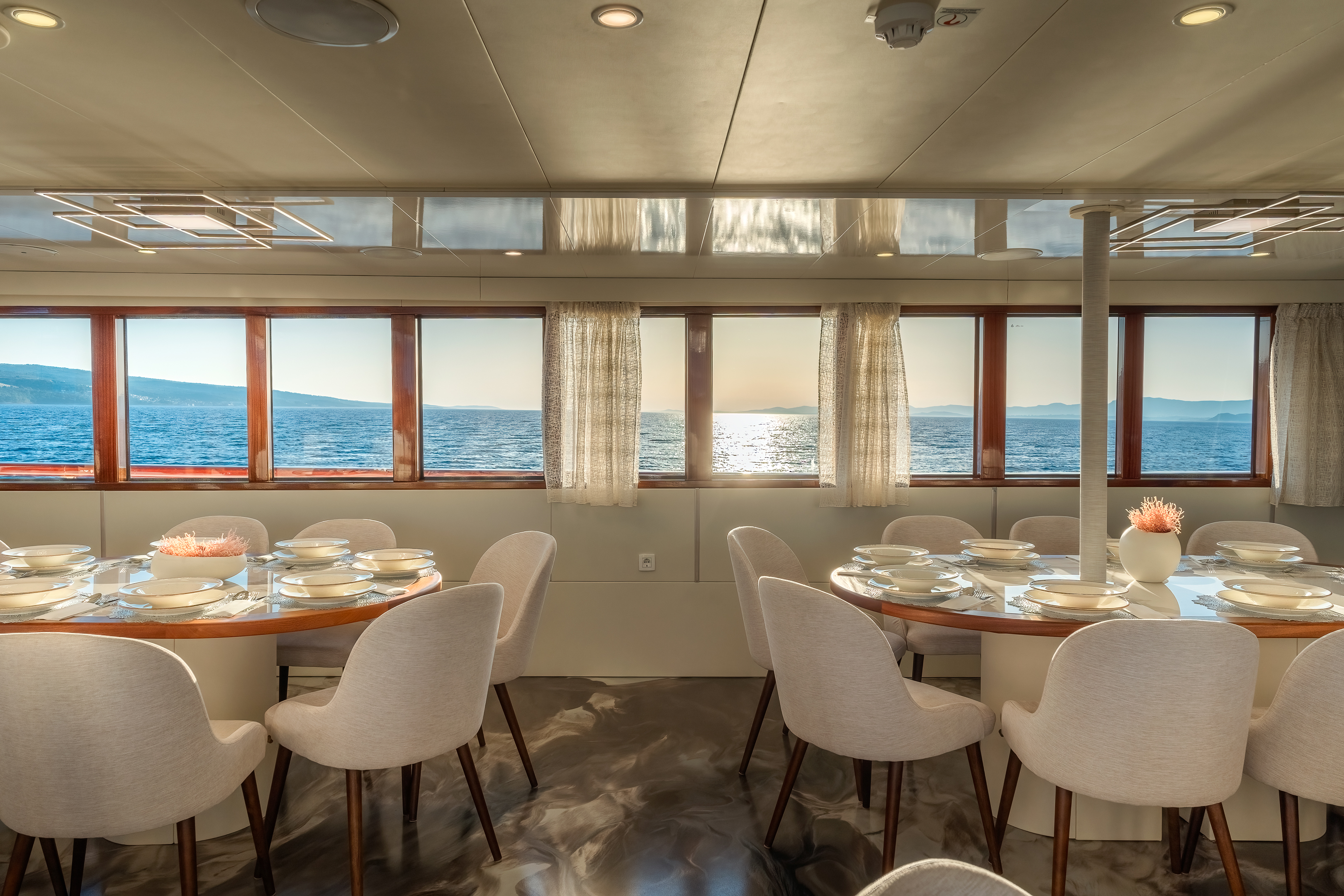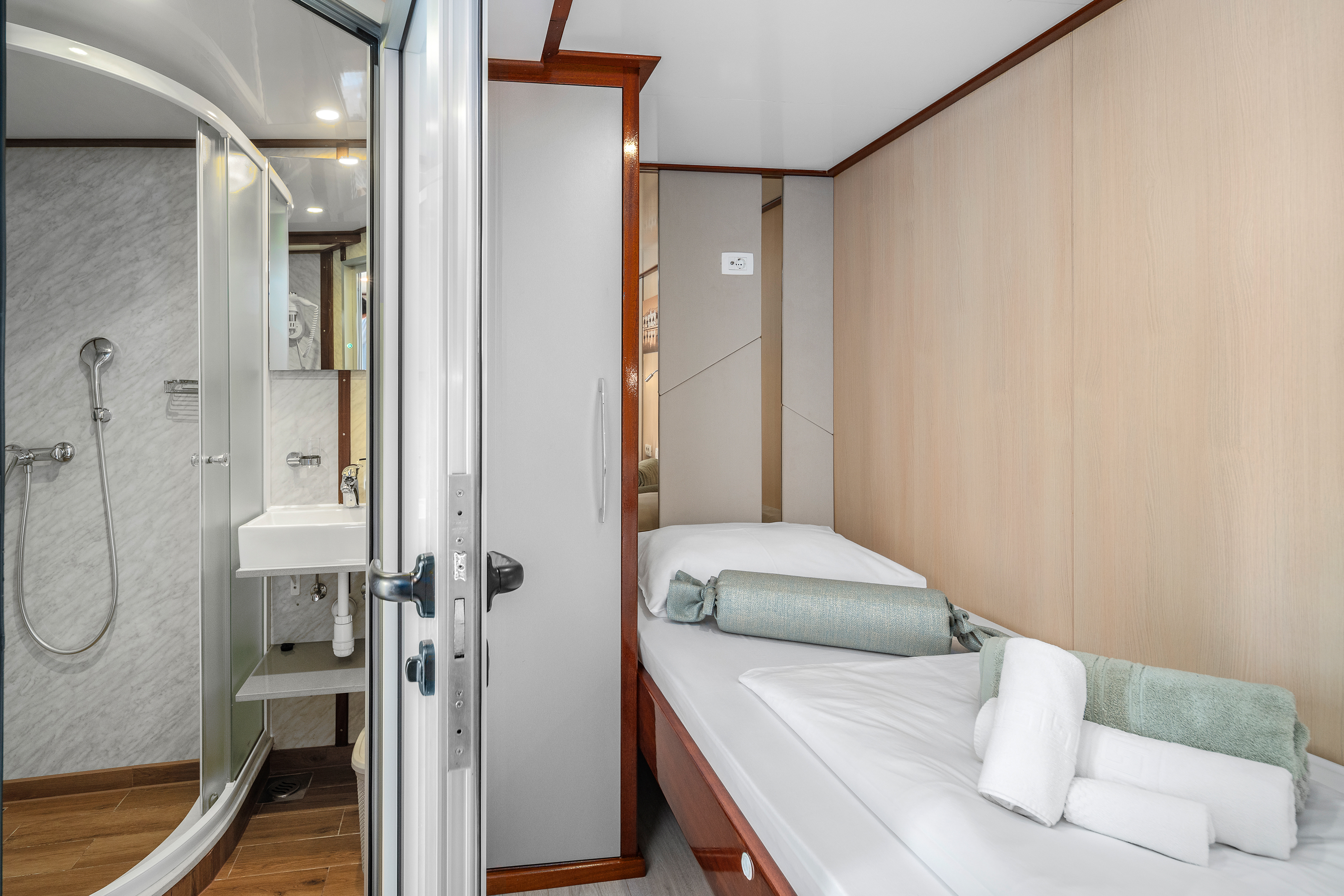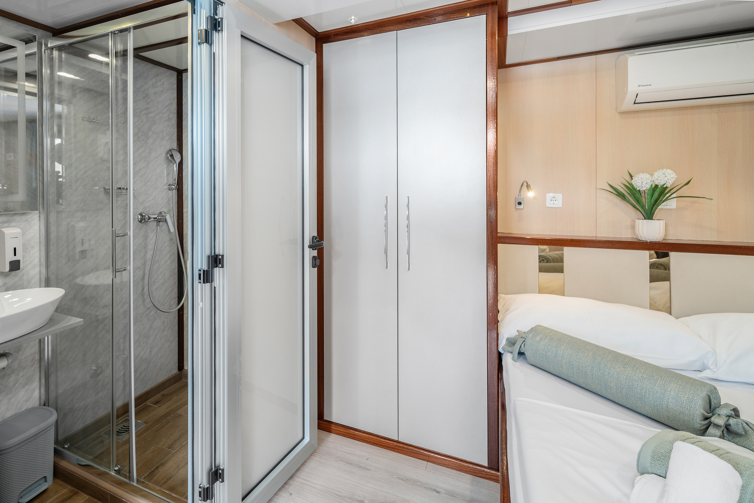 Twin bed cabin (with pullman)Air conditionDouble bed cabinBed linenTowelsSwimming platformAft deck loungeSmart TVRoom ServiceStainless steel boarding ladder with irocco stepsHidraulic steering system with steering position at bridgeSun awningSun deckshowerBoard gamesWi-FiSunbathing cushionsSunbathing areaCompasTrue heading autopilotEcho sounderSamyung color radarStandard solas navigation lightsTwo horseshoe bouys with warning lightsSolar life jackets for each passengerAutomatic inflatable liferaft for 50 peopleSmoke detectors in each cabinCentral alarm for fire equipmentPortable fire extinguishers for corridors and salonFire extinguishers in the engine using aerosolVHF radio DinghySUPSnorkel and Fishing gearCinema with a projector on the sun deckToorx Race CrossSpinning BikeProfessional Diving equipment – (extra charge)