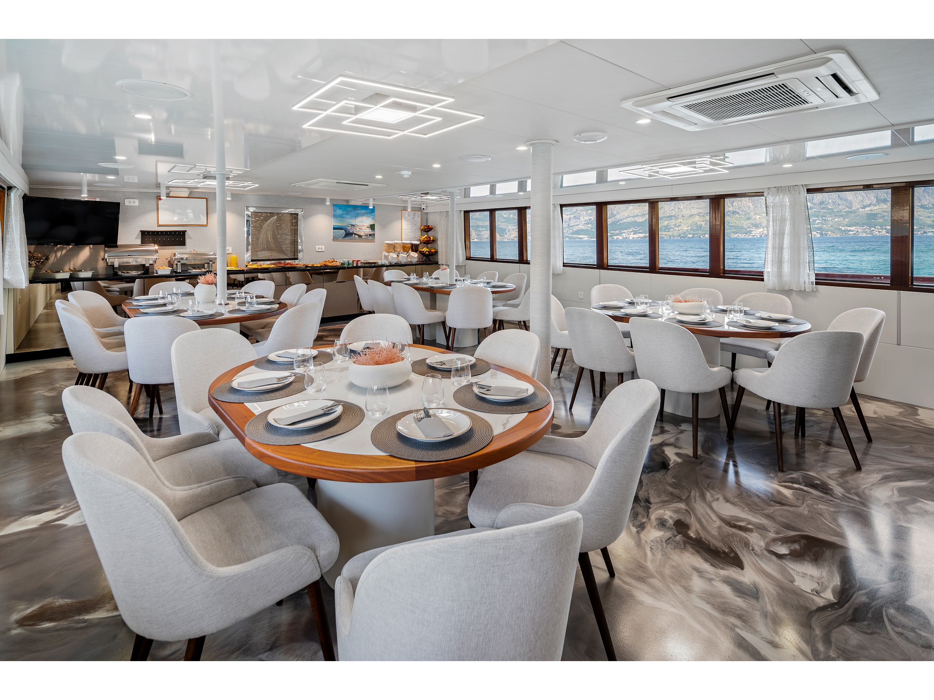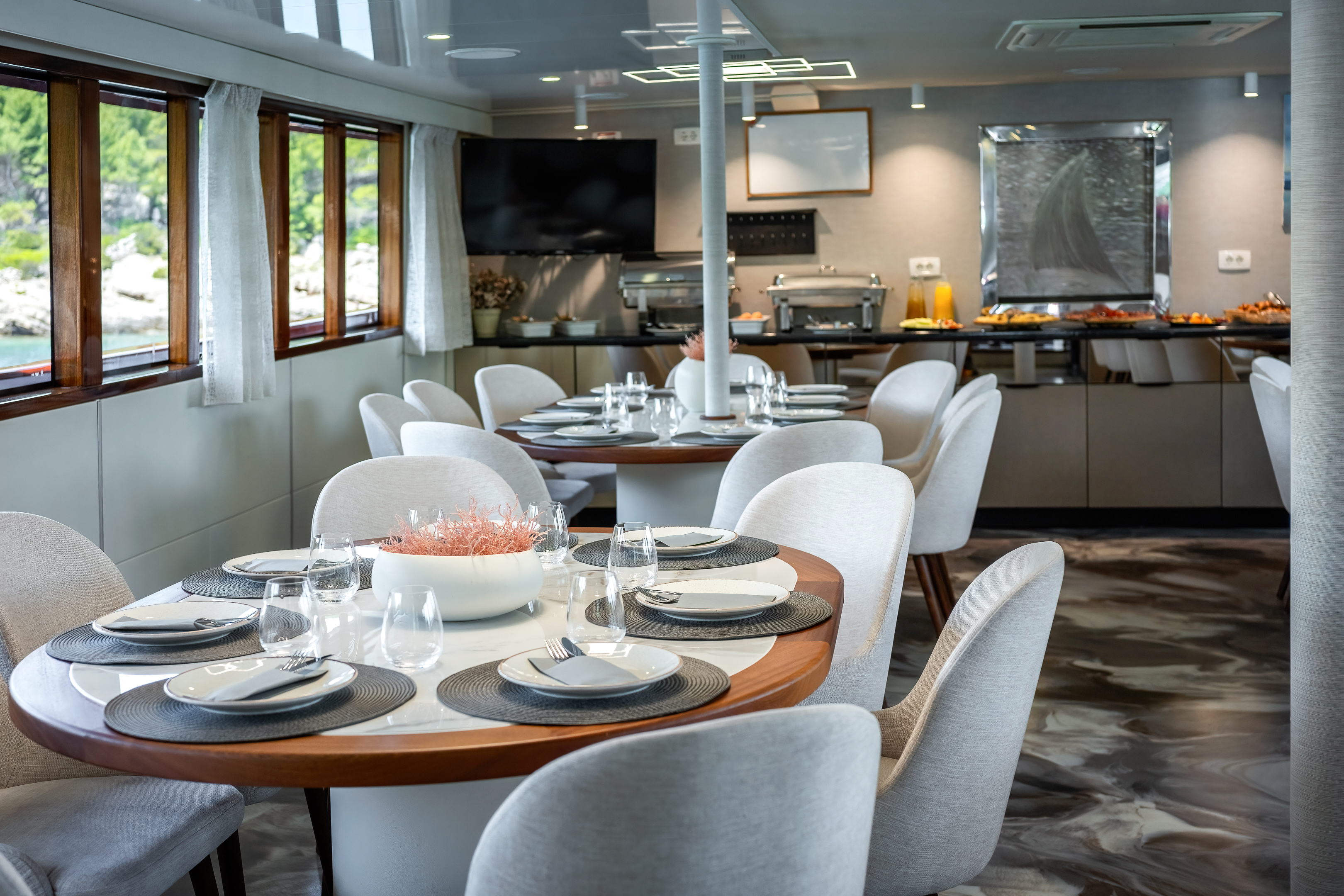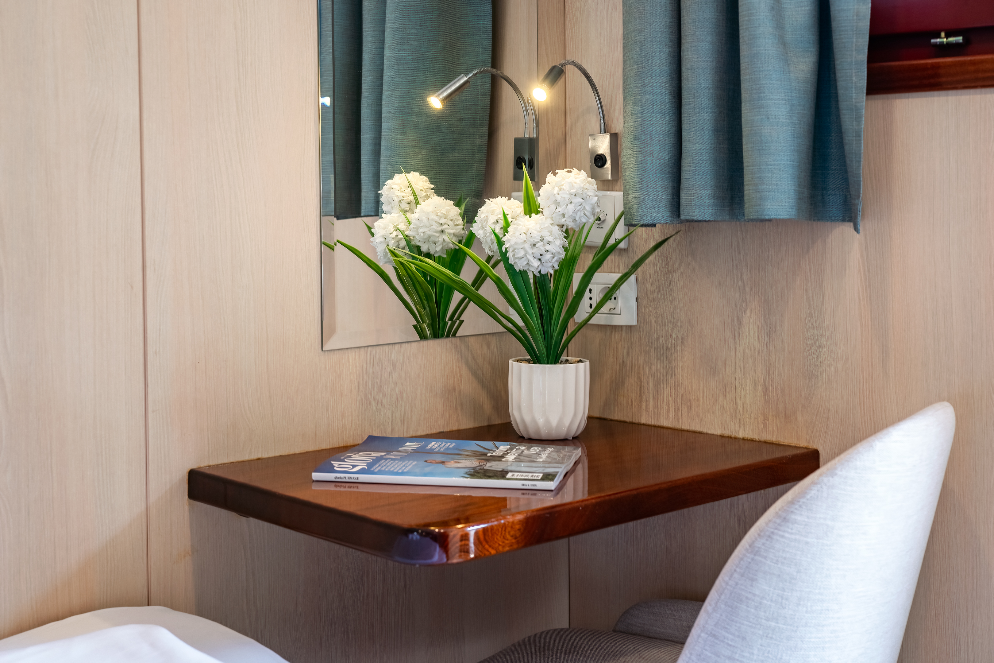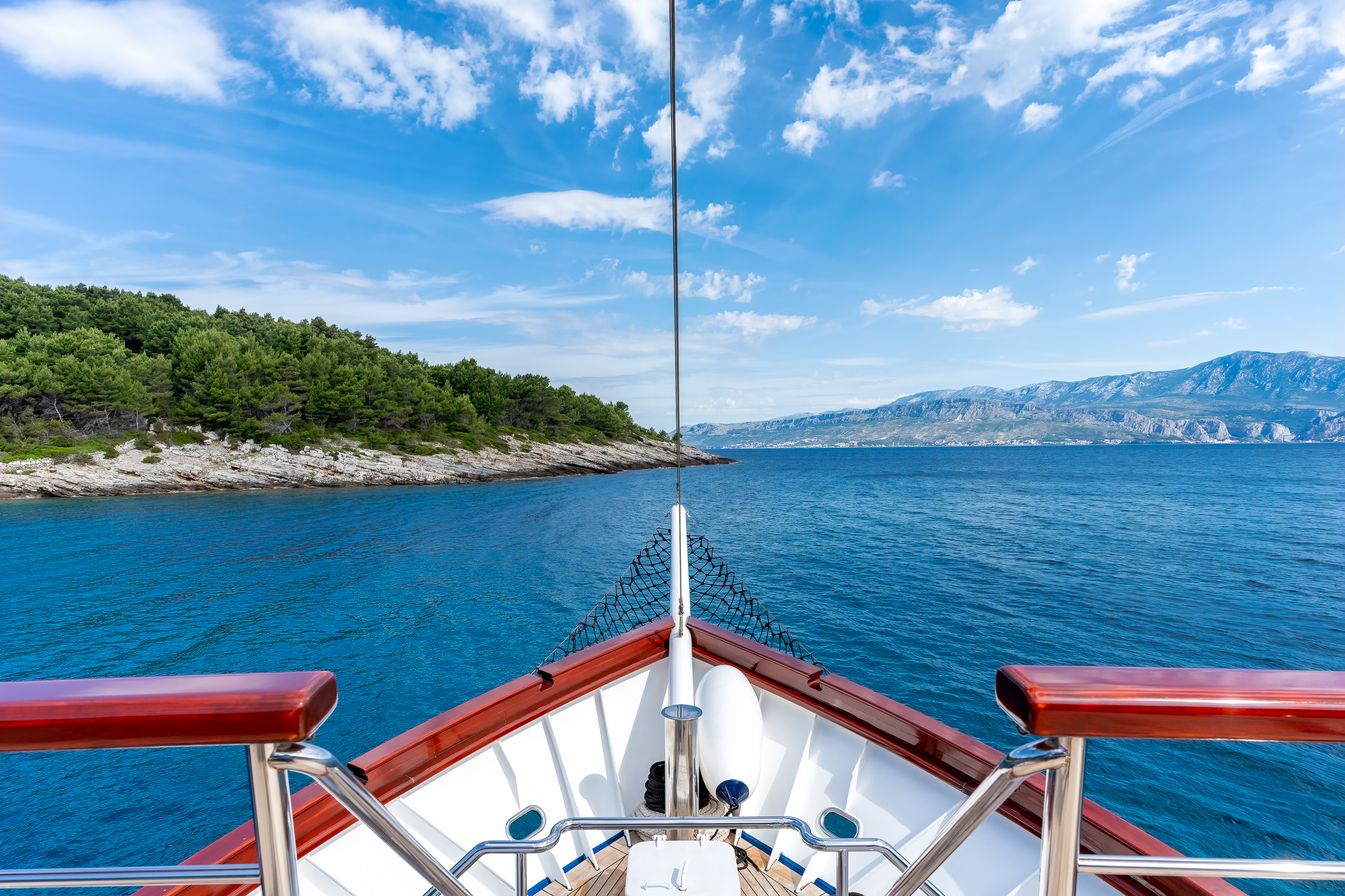 Twin bed cabin (with pullman)Air conditionDouble bed cabinBed linenTowelsSwimming platformAft deck loungeSmart TVRoom ServiceStainless steel boarding ladder with irocco stepsHidraulic steering system with steering position at bridgeSun awningSun deckshowerBoard gamesWi-FiSunbathing cushionsSunbathing areaCompasTrue heading autopilotEcho sounderSamyung color radarStandard solas navigation lightsTwo horseshoe bouys with warning lightsSolar life jackets for each passengerAutomatic inflatable liferaft for 50 peopleSmoke detectors in each cabinCentral alarm for fire equipmentPortable fire extinguishers for corridors and salonFire extinguishers in the engine using aerosolVHF radio DinghySUPSnorkel and Fishing gearCinema with a projector on the sun deckToorx Race CrossSpinning BikeProfessional Diving equipment – (extra charge)