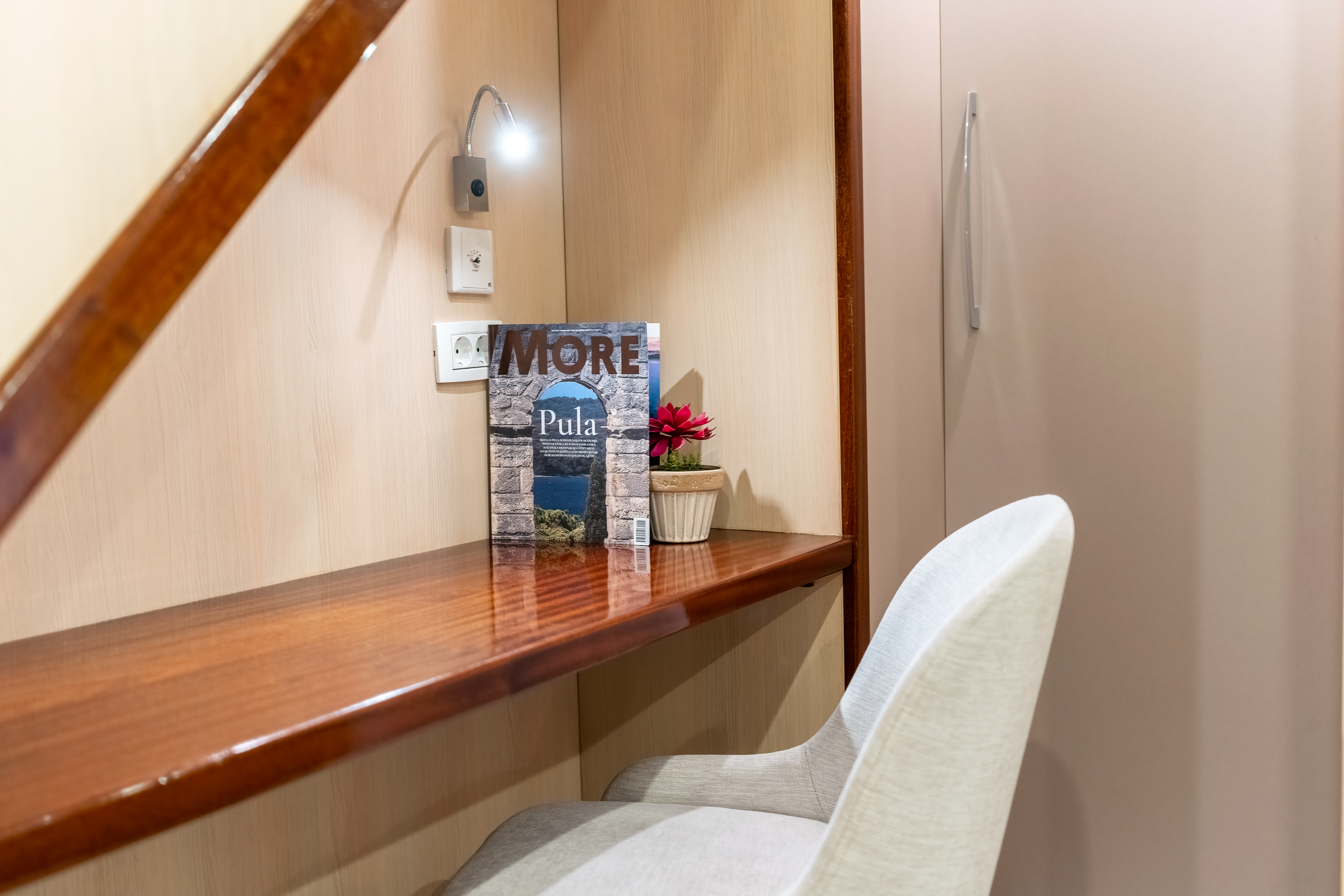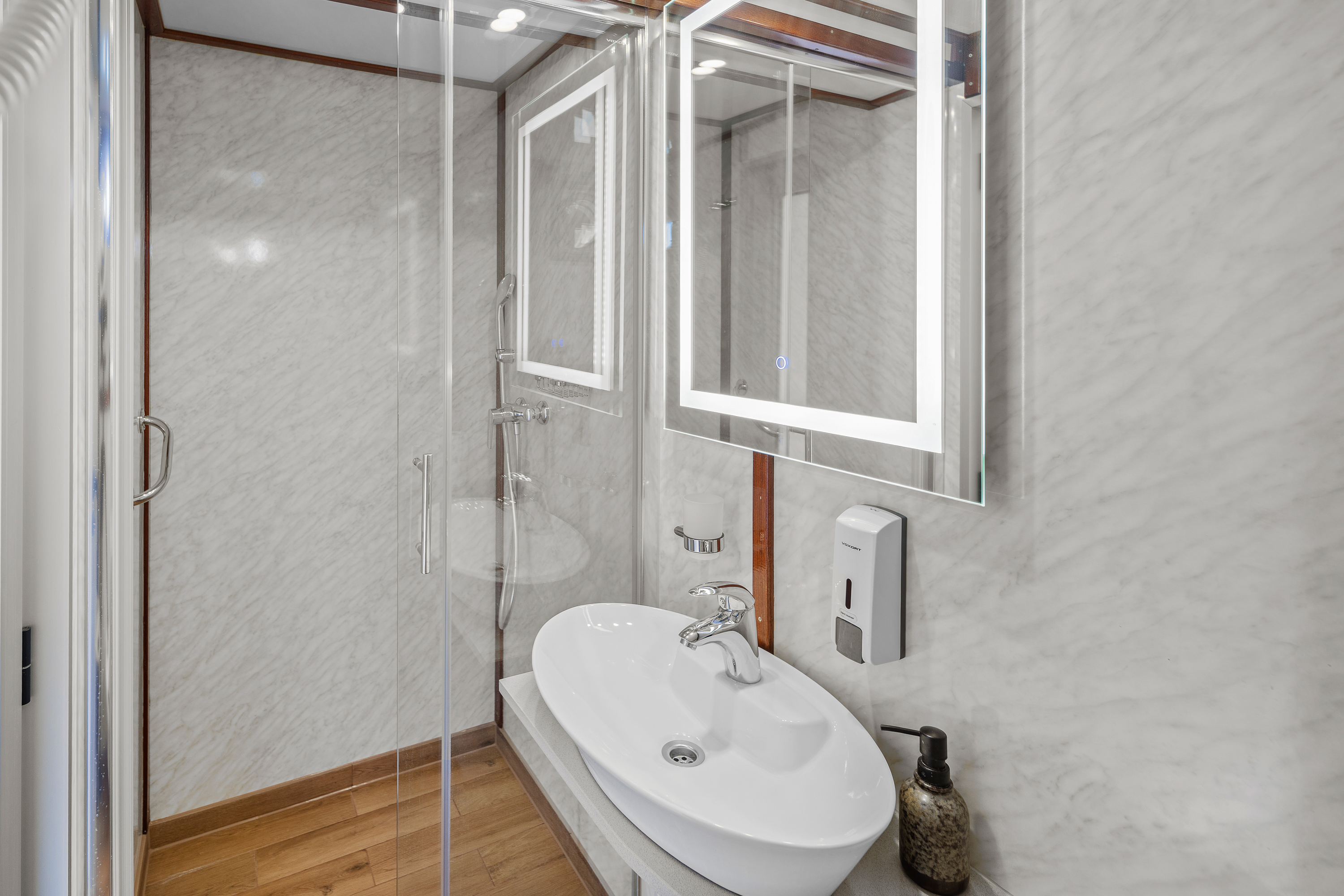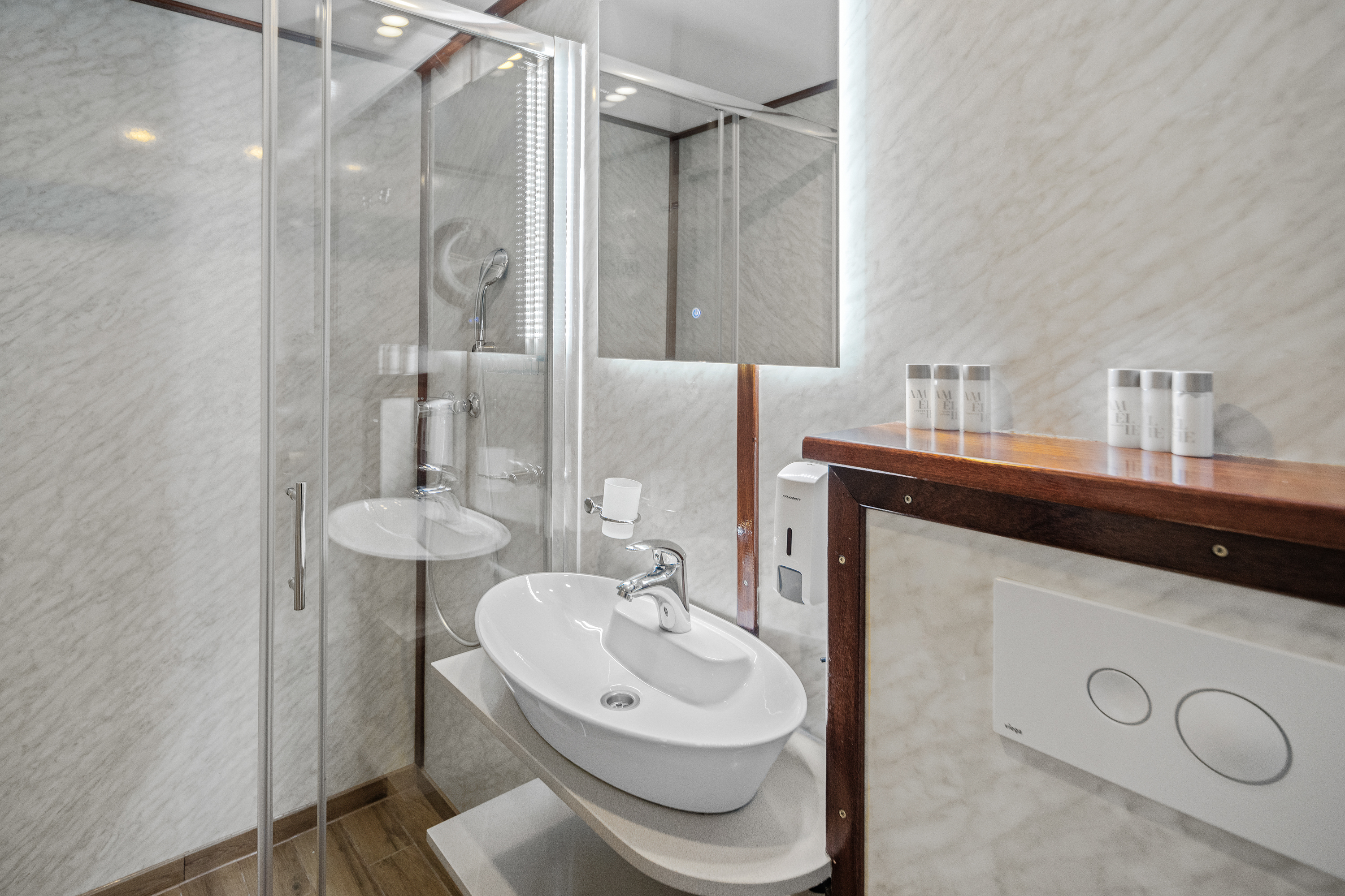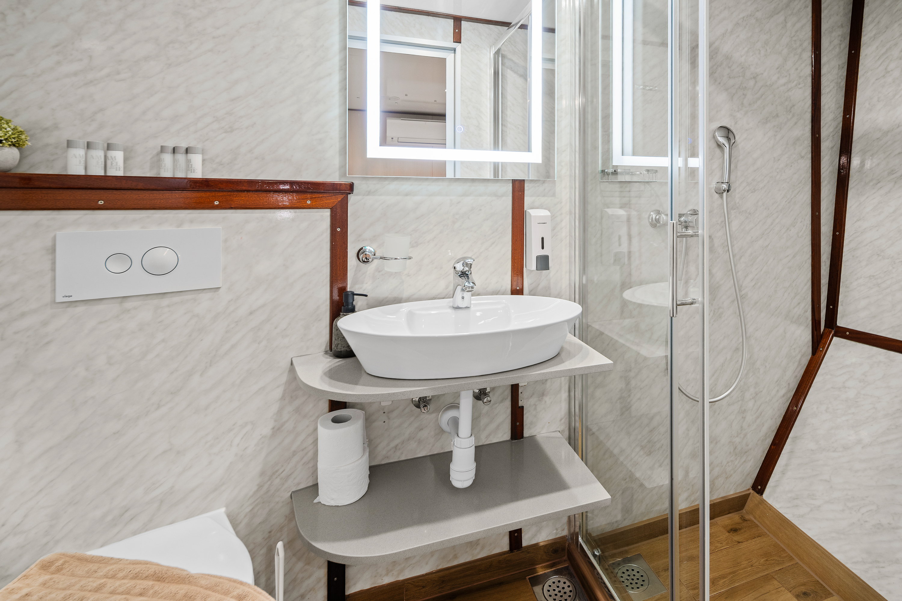Twin bed cabin (with pullman)Air conditionDouble bed cabinBed linenTowelsSwimming platformAft deck loungeSmart TVRoom ServiceStainless steel boarding ladder with irocco stepsHidraulic steering system with steering position at bridgeSun awningSun deckshowerBoard gamesWi-FiSunbathing cushionsSunbathing areaCompasTrue heading autopilotEcho sounderSamyung color radarStandard solas navigation lightsTwo horseshoe bouys with warning lightsSolar life jackets for each passengerAutomatic inflatable liferaft for 50 peopleSmoke detectors in each cabinCentral alarm for fire equipmentPortable fire extinguishers for corridors and salonFire extinguishers in the engine using aerosolVHF radio DinghySUPSnorkel and Fishing gearCinema with a projector on the sun deckToorx Race CrossSpinning BikeProfessional Diving equipment – (extra charge)