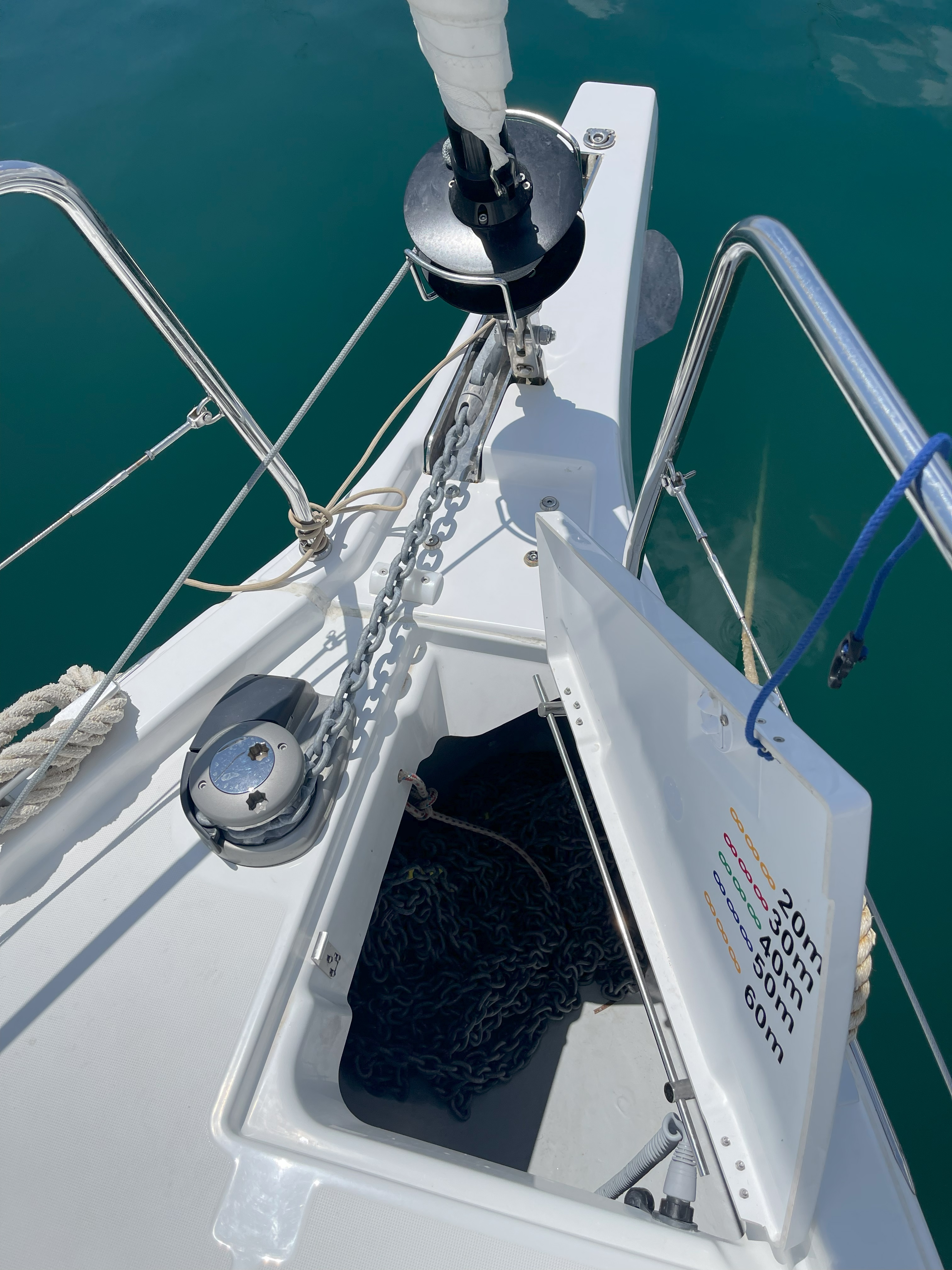 A/CGangwayMain anchor-chainFendersAnchor windlass electricHand bilge pump and handleSwimming ladderDoor panels-keysBoat hookWinch handlesDinghy pumpoarsOutboard motorPlastic bucketWater JerrycanDiesel jerrycanEngine oilFuel funnelGas bottlesSpare AnchorMooring linesCockpit tableCockpit cushionsSet of toolsSpare fusesGenoaMain sailSprayhoodBimini topHorseshoe lifebuoyFloating lightEmergency helmTorch lightLife raftBlack BallRadar reflectorSafety beltsFire extinguishersFirst aid kitLife jacketsFog hornInflatable Life jacketsCockpit compassSpeed logEcho sounderWind instrumentsHand bearing compDividerParallel rulerGreek Waters PilotGPSPlotter (external plotter ) Dinghy repair kitEngine's sparesSails repair kitToolboxBoat documentsBoat manualsLinen: Bed sheets, Pillows, Pillows cases, Blankets, TowelsGas stove & ovenElectric fridgeCutlery - Kitchen equipmentMugsplatesglassesspoonsknifesBowthrusterElectric toiletsBattery charger220 Volt socketsSolar panel Snorkeling equipment