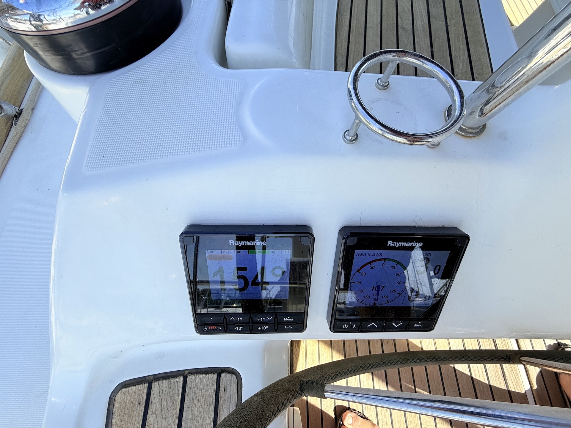 Gas stove with ovenRefrigeratorBlue HullBow ThrusterDinghyRadio/MP3 playerAutopilotGPS ChartplotterVHFEcho sounderSpeed logWindHeatingSolar panelsHot water systemLithium service batteriesBiminiElectric windlassTeak cockpitSprayhoodCockpit showerFurling mainsailFurling genoa
