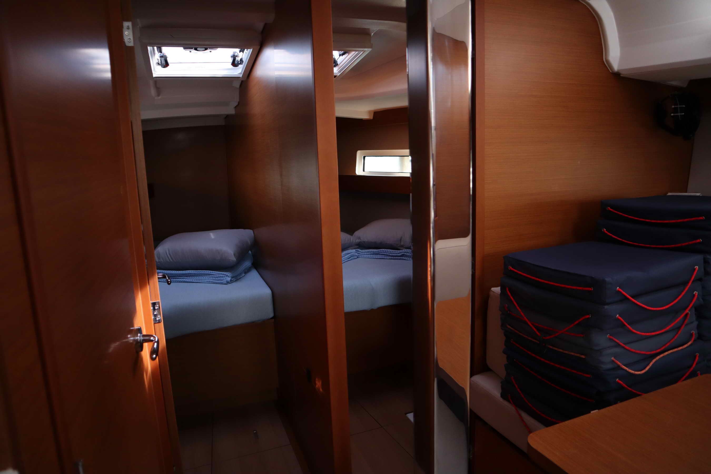 Cockpit cushionsAutopilotBow thrusterCompassGPSGPS chart plotterLogge/Lot/SpeedNautical chartsNavigation setWind instrument/AnemometerBlack Water TankFire extinguisherFirst aid kitFlashlightSafety equipmentSet of toolsVHF radioSolar panelsAnchorBimini topCockpit/stern, outside showerDeck brushDinghyElectric anchor windlassFendersFolding cockpit tablePlastic bucketSprayhoodHot waterKitchen utensils (Galley equipment, cutlery)OvenRefrigeratorStoveConvertible table in salonElectric fans in cabinsElectric toiletInside showerFusion radioOutdoor speakersUSB