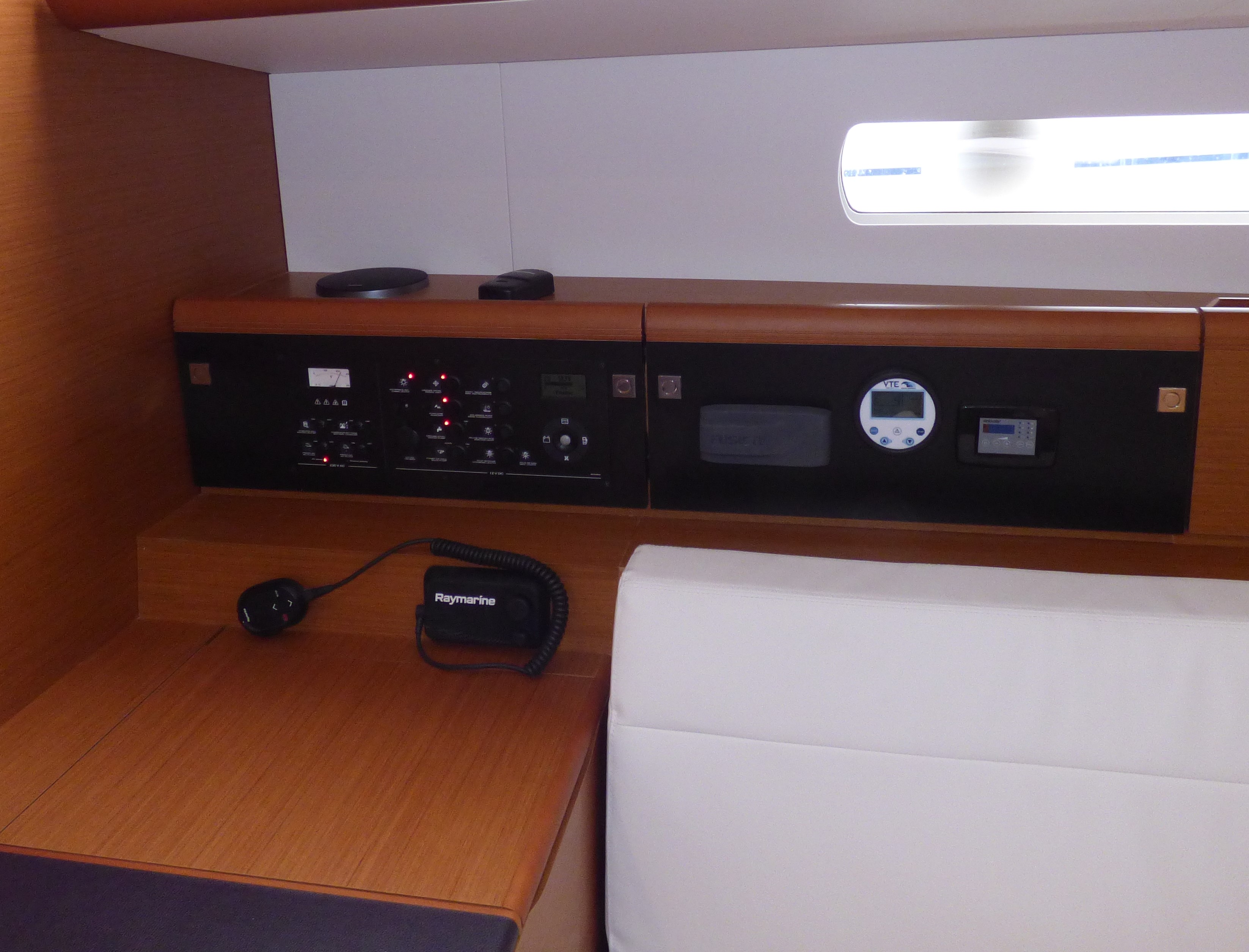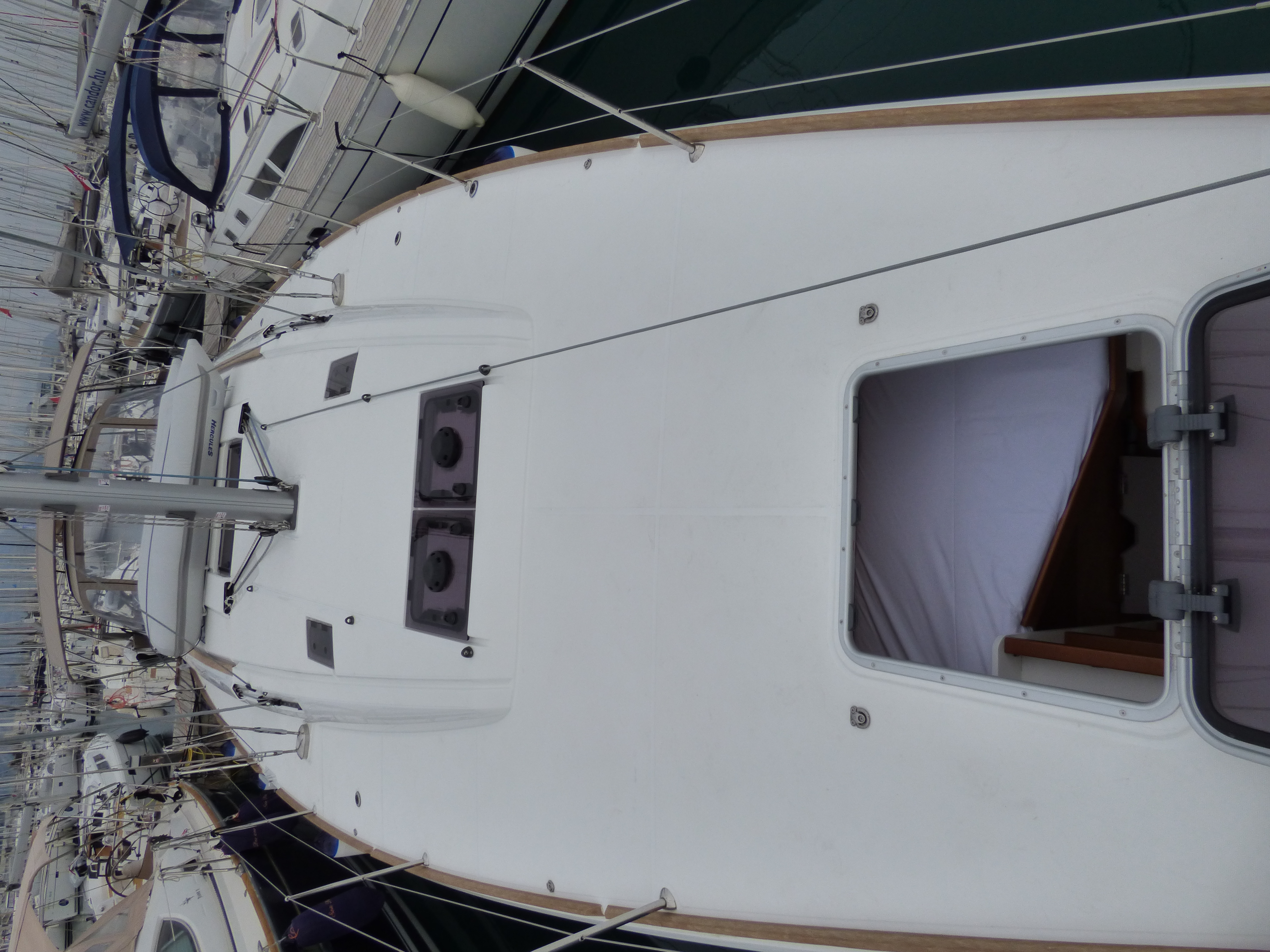 In-Mast FurlingElectric Halyard WinchFurling GenoaRaymarine tridatawindmeterLog/SpeedoAutopilotDepth GaugeGPS ChartplotterGeneratorMP3 playerRadio/CDCockpit SpeakersBed linenstandard towelsAir ConditioningHot Water SystemBathing PlatformElectric Windlasssaltwater tapRefrigeratorFreezer220V / 2kW inverterShore Power ConnectionOutboard engineDinghy InflatableAuxiliary anchorSafety harnessFire extinguisherMain anchorCalibrated anchor chainFirst aid kitLifebuoyFloating lineLife vestsbosun's chairtorch w. batteryEmergency tillerrechargeable torchtools, spare partsLiferaftDistress flaresspare ropeswater hoseholding tankbow thrusterTeak cockpitcockpit showerswim laddergangwayIceboxSprayhoodBimini topCockpit upholstery seating